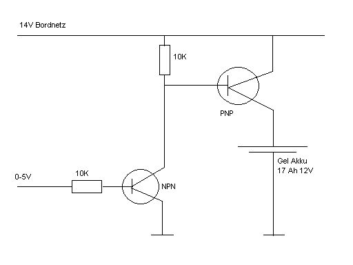 Hallo, ich habe hier einen Gel Akku mit 17Ah. Diesen würde ich gerne im Auto laden, das so schnell wie möglich. Ich habe bisher gelesen das man diese Art von Akku mit konstant Spannung und Strombegrenzung laden sollte. Bei der Begrenzung habe ich 1/10tel der Kapazität gelesen, also bei mir 1,7A. Ist das soweit richtig? Ich habe nun mit einem Controller eine PWM erzeugt, diese etwas geglättet und auf einen NPN Transistor gegeben. Dieser wiederrum steuert einen PNP Transistor an der den Strom steuert. Ich würde nun gerne mit dem Controller den Strom messen und auf 1,7A halten bis die Schlussspannung am Akku erreicht ist. Die Bordspannung im Auto liegt bei ca. 14V habe ich gemessen. Im Anhang habe ich nochmal die Schaltung die ich bisher benutze. Aber wenn die Batterie zu voll wird dann kann ich den Strom nichtmehr halten. Bin ich so völlig auf dem Holzweg oder was könnte man da noch ändern? Vielen Dank schonmal Gruß Philipp