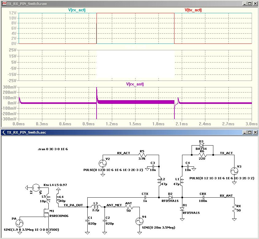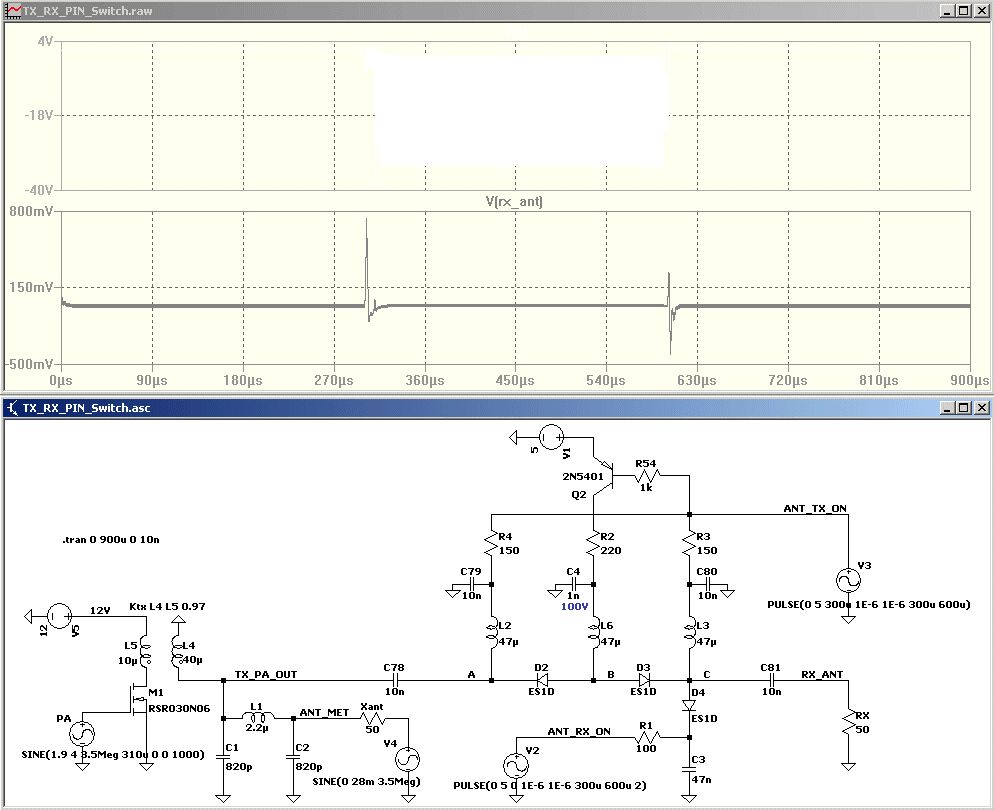 Hallo Ihr Lieben, die Schaltung sollte wie folgt funktionieren. Wenn RX_ACT (Empfänger aktiv ist, 5V Pegel am R5 von Basis Q1) auf High ist, ist gleichzeitig TX_ACT (Sender still, 0V am R6 von Q2) auf Low. Dabei Leitet D2 das HF-Empfangssignal an den Widerstand RX, der symbolisch für den Empfangsteil steht. Im umgekehrtem Fall ist D2 gesperrt und D1 schließt das HF-Signal von der PA kurz, damit der Empfänger vom Sendersignal entkoppelt ist. In der Simulation sieht man in der ersten ms ein 50uV Signal an D2 anliegen in der zweiten ms ein 10V Signal, welches nicht zu RX durchdringen sollte. Die Simulation funktioniert in LT-Spice soweit und ist schlüssig. Was mir fehlt ist ein geeignetes Modell der PIN-Dioden, deshalb meine Frage an Euch. Gruß Markus DL8MBY