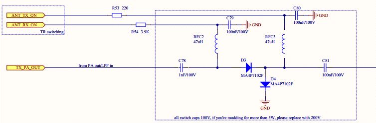 > Wie sieht es mit der Dämpfung bei Empfang aus? > Der Empfänger sollte durch den TX/RX-Switch nicht taub werden. In der Originalschaltung ist C78 zu klein. Dabei handelt es sich wohl um einen Kompromiss. Ansonsten komme ich auf ~1dB Dämpfung. Mit "richtigen" Pindioden wird das sicherlich noch besser. Beim der Simulation komme ich während des Empfangs auf 5mV am Rx bei 10 Watt Sendeleistung. Beim Senden kann man ein paar mA mehr investieren, aber beim Empfang/Akkubetrieb sollte der Stromverbrauch nicht ausufern.