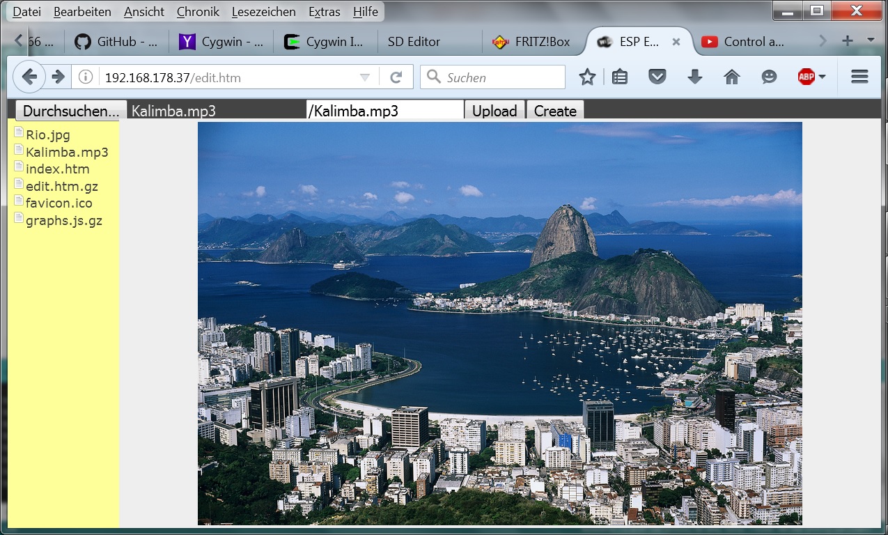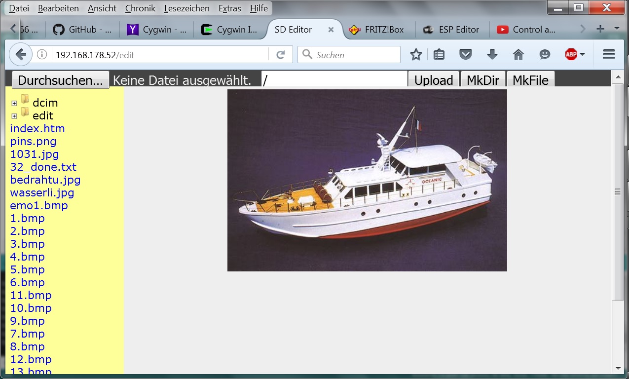 Will man dieses günstige Display Ebay-Artikel Nr. 272282444553 mit der Arduino-IDE unter Windows7/64-bit und dem NodeMCU LUA Amica R2 |ESP8266 Wifi Board z.B.: http://www.electrodragon.com/product/nodemcu-lua-a... in HW-SPI verwenden, so wird man zunächst hier fündig: https://github.com/gnulabis/UTFT-ESP8266 Aber bei gleichzeitiger Anbindung der SD-Karte, dem XPT2046 und dem SPI-Display hatte ich Schwierigkeiten. Touch und Display --> ja. Und SD-Karte --> nein ; Auch https://github.com/Links2004/Adafruit_ILI9341 hat Probleme mit dem Touch_IC; Man braucht: <ESP8266WiFi.h> <WiFiClient.h> <ESP8266WebServer.h> <ESP8266mDNS.h> <SPI.h> <SD.h> <Ucglib.h> // Required <XPT2046.h> Um die Ucglib zu erhalten, muss zunächst die https://github.com/spapadim/ucglib (plus this patch: https://gist.github.com/spapadim/a4bc258df47f00831006) - See more at: http://www.esp8266.com/viewtopic.php?f=32&t=5560#s... und: https://github.com/spapadim/XPT2046 und nach den Hinweisen hier: http://www.esp8266.com/viewtopic.php?f=32&t=5560&s... den Moloch "Cygwin" http://cygwin.com/install.html (daraus: Installing and Updating Cygwin for 64-bit versions of Windows); Wie dort erwähnt, hat die default Installation nicht alle Tools. Wichtig ist, während der Inst. bereits die zlib auszuwählen! Dann: You need to run tools/release/arduino/create_release.sh to make a zip with directories in Arduino library layout (or use tools/release/arduino_new_lib_format/create_release.sh but remove the git commit and pandoc stuff). - See more at: http://www.esp8266.com/viewtopic.php?f=32&t=5560&s... (* Kommentar von User: spapadim - dem Autor der Ucglib) "In that case, doing what the shellscript does manually is perhaps easiest (basically, it's just: cppsrc -> library root, csrc -> clib subdir, and edit the include in Ucglib.h to point into clib/ucg.h). - See more at: http://www.esp8266.com/viewtopic.php?f=32&t=5560&s... Hier wird die Vorgehensweise beschrieben: http://www.esp8266.com/viewtopic.php?f=32&t=5560&s... Nach dem Download der Ucglib und entpacken(besser auf C:) im Ordner C:\ucglib-master\tools\release\arduino durch cd mit Cygwin die sh create_release.sh ausführen. Dies liefert dann die ucglib_arduino_v1.3.zip, die, wie gewohnt, über Arduino_IDE --> Sketch/Bibliothek einbinden, eingefügt werden kann. Diese Library lässt sich nicht einfach auf einen anderen Windows-Rechner kopieren. Diese Schritte müssen auf jedem Rechner seperat ausgeführt werden! Zum Testen hab ich dann \ESPAsyncWebServer-master und SDWebServer ausgeführt(ergooglen) .. Ganz Mutige können auch newSDWebServer_GPIO16_Touchn5b ausprobieren .. (ein Bildchen[emo2.jpg] für die SD-Karte. Können aber mit /edit auch hinzugefügt werden)
