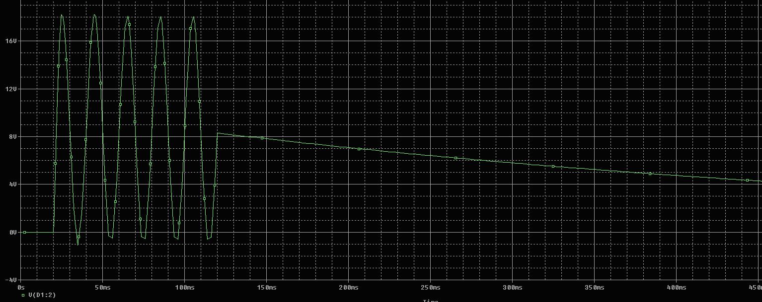 Hallo, ich habe einen einfachen Wechselstromkreis mit Dioden (siehe Bild). Leider kann ich mir aber das Ergebnis, d.h. die Simulation nicht erklären. Die Dioden verschieben zwar die Sinuskurve in die positive Hälfte, aber der Kondensator glättet sie nicht. Wo liege ich falsch? Danke im voraus!