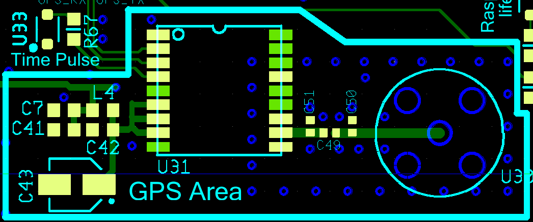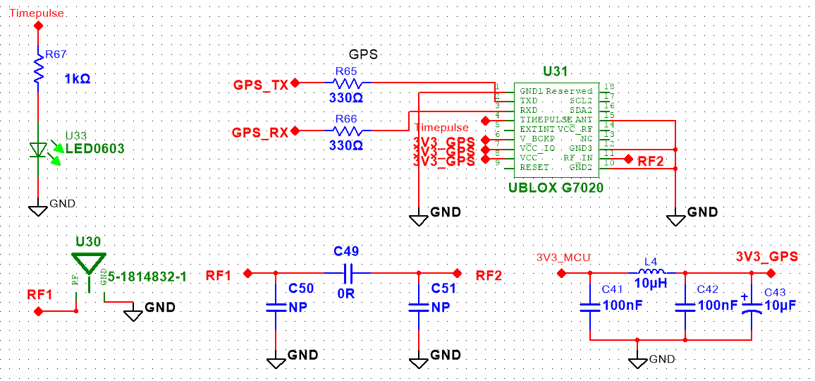 Hallo, Ich nutze in meiner Schaltungn einen MAX-7C von Ublox, jedoch bekomme ich leider keinen Empfang. Ich habe mal die Antenne gemessen (habe gerade zuhause nur ein kleines 300MHz Oszilloskop und Multimeter zur hand) und die passive Externe Antenne hat einen unendlich hohen Widerstand gegen Masse, ist das korrekt? Momentan habe ich die 50Ohm Leitung nicht angepasst, sprich es ist nur ein 0 Ohm 0402 Widerstand in der Leitung. Die Leiterbahnbreite wurde für 50 Ohm berechnet. Meine GPS Schaltung ist eigentlich ziemlich Grundlegend, habe ich dort vielleicht einen Fehler gemacht? Ich bekomme selbst nach 30 Minuten keinen Fix rein.