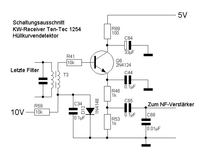 Die hier bislang vorgestellten Beispiele von Hüllkurvendetektoren sind Fehlkonstruktionen. Ich habe mal ein Beispiel eines Hüllkurvendetektors, der auch funktioniert. Der Transistor Q8 neben den NF-Verstärker TDA1013B, ist der Hüllkurvendetektor. Die Bezeichnungen sind etwas verschwommen. http://archiv2.funkamateur.de/download/article/41999050505005 Das letzte Beispiel von "Mast (Gast)" könnte funktionieren wenn man C12 weglässt und die Gegenkopplung R8 nur an T4 anschließt und die Basis T4 einen Koppelkondensator bekommt.