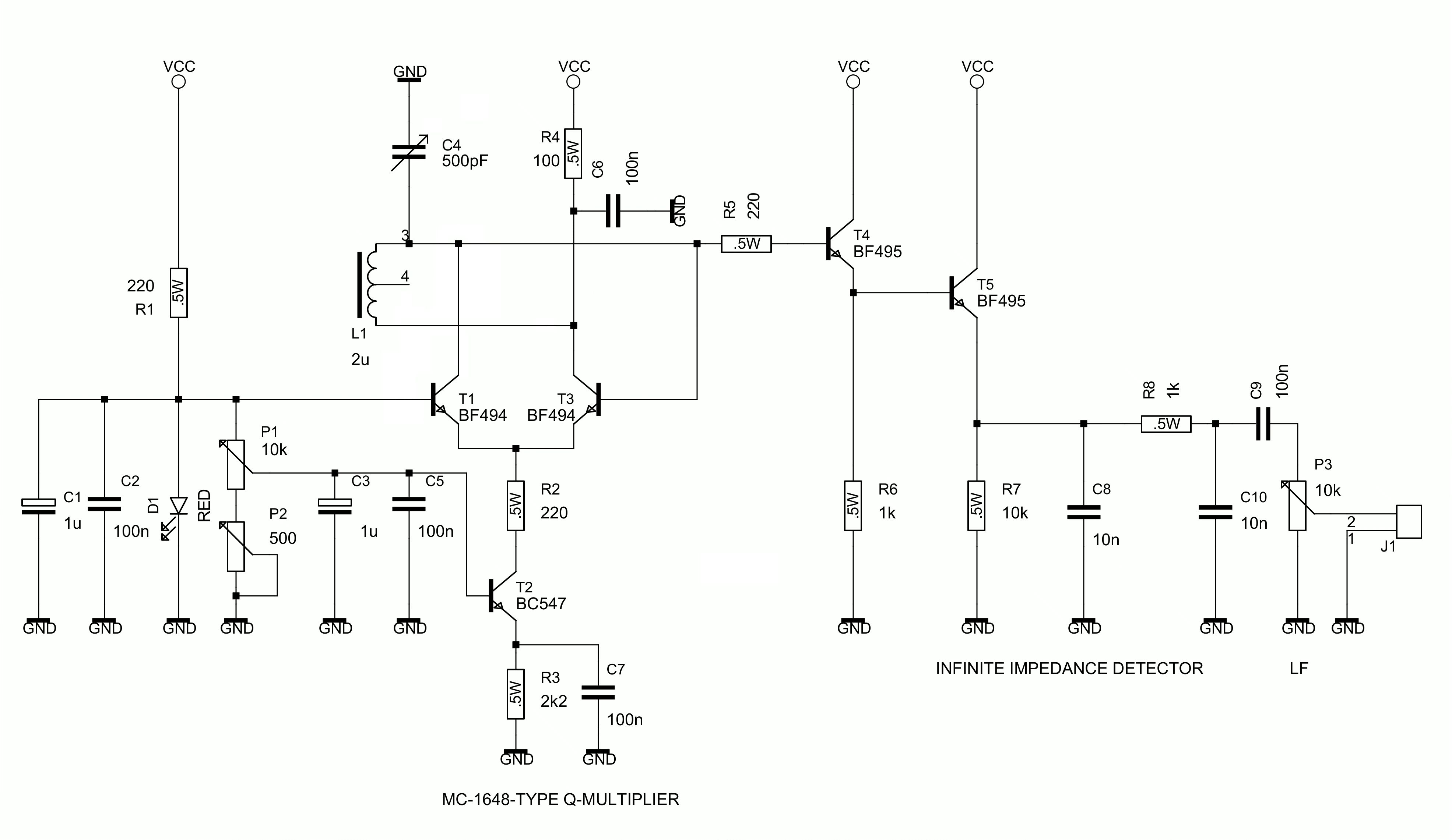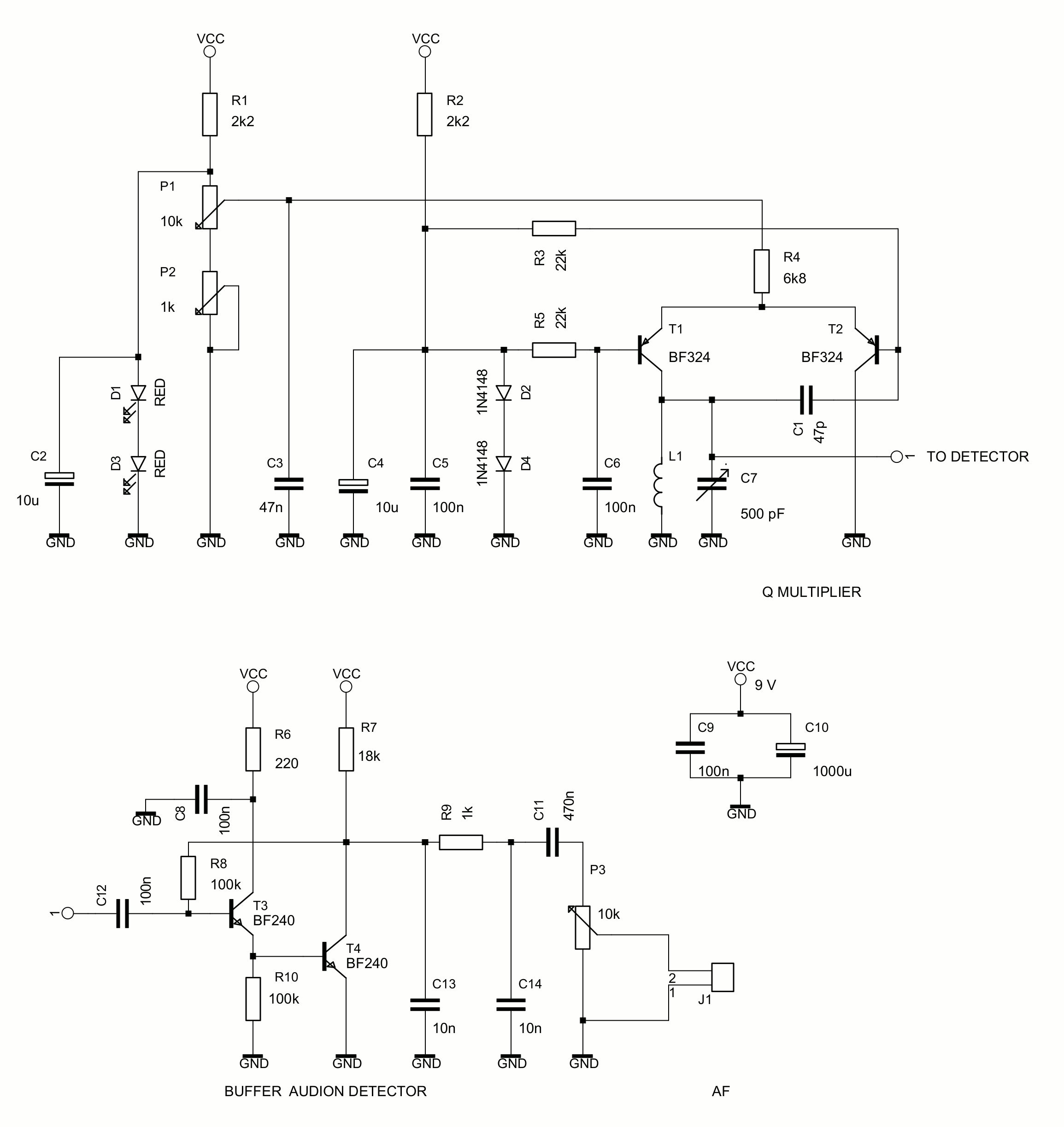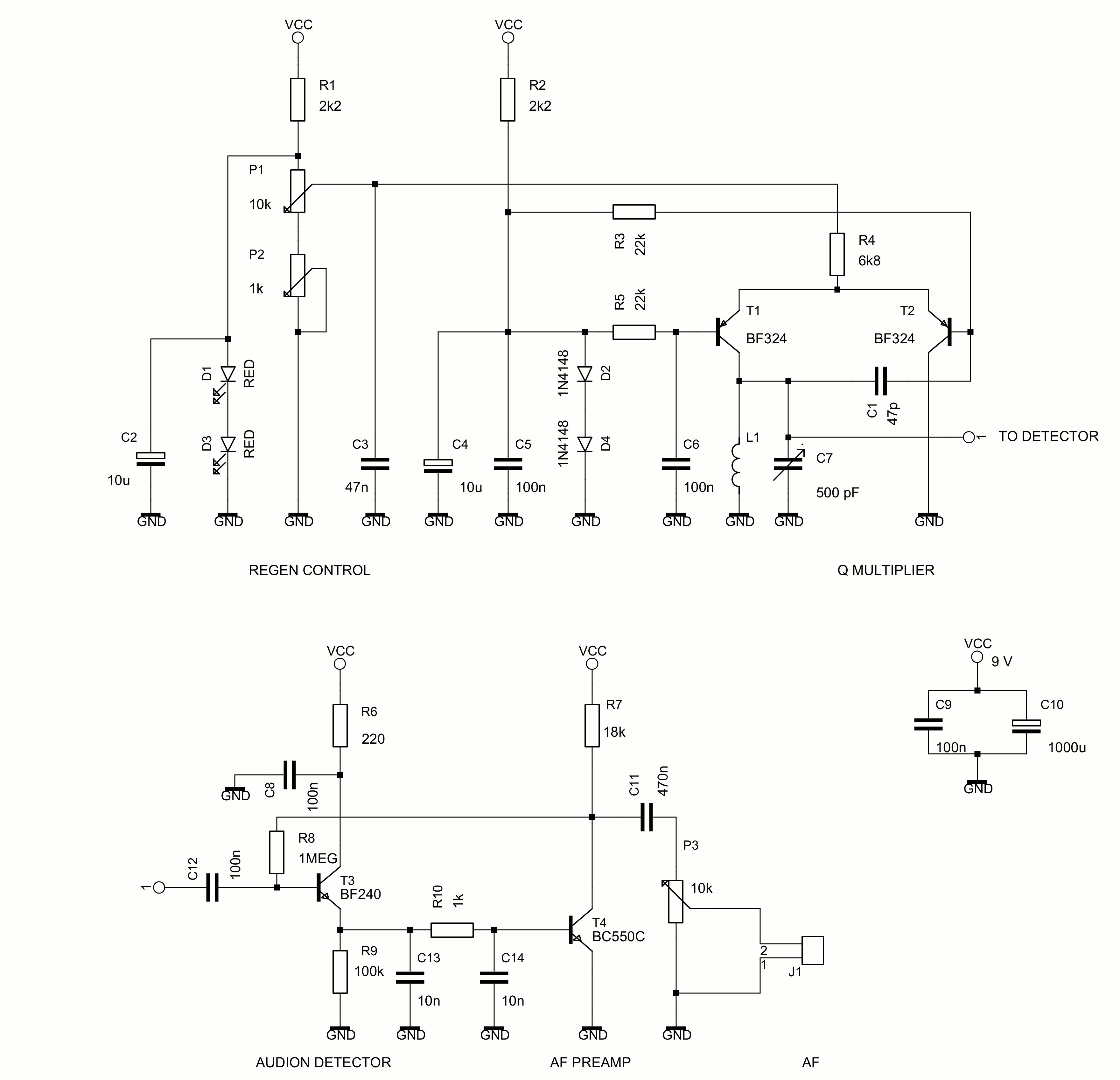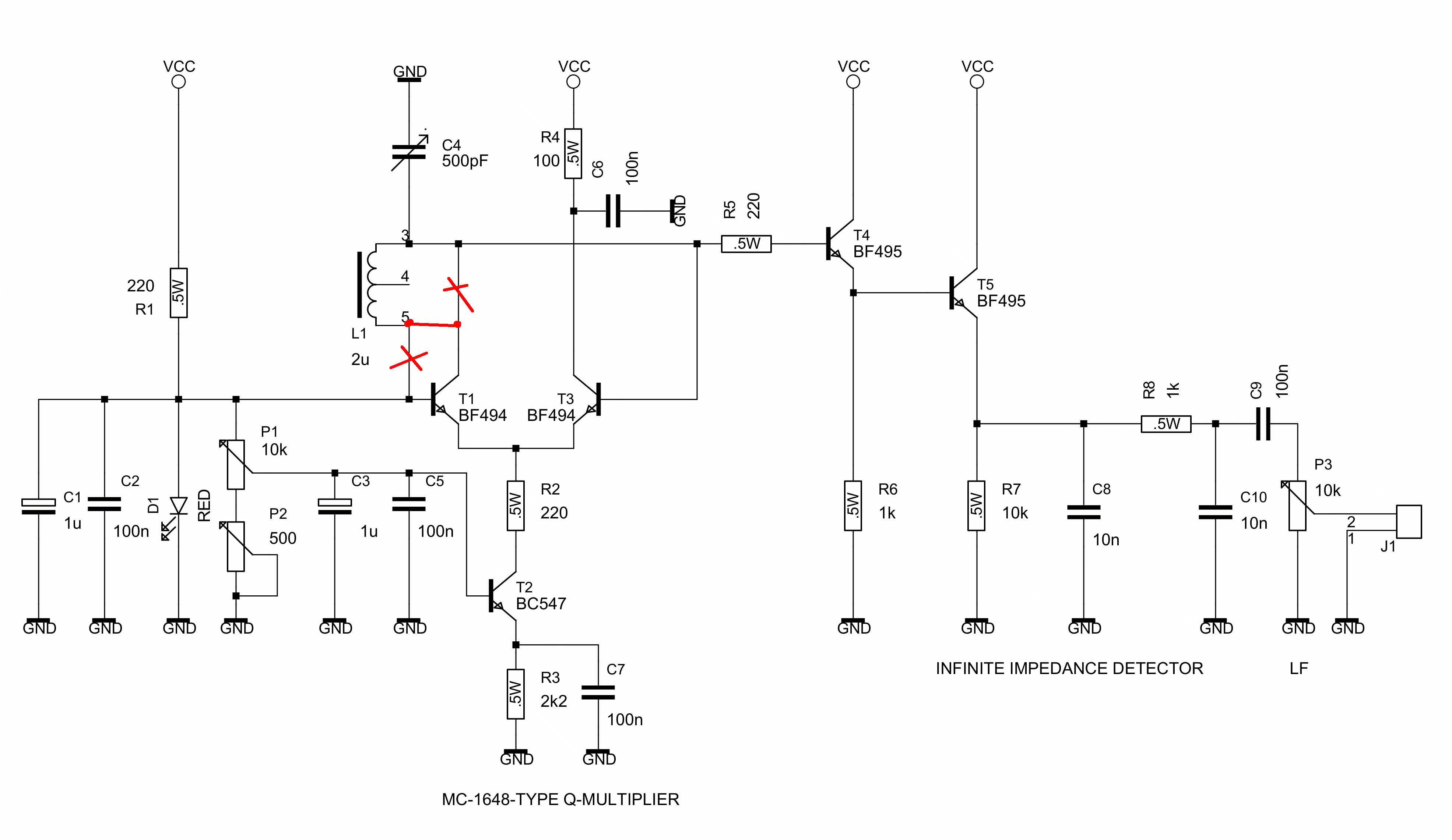 Hier gibt es einen Imfinite Impedance Detector T5 der gepuffert ist von der Pufferstufe T4. T4 isoliert den Schwingkreis L1/C4 von Impedanzänderungen aus der Detektorstufe T5 wenn die Entdämpfungsstufe rund T1, T2 und T3 in und aus Schwingen geht. Wenn die Detektorstufe T5 direkt auf das heiße Ende des Schwingkreises verbunden ist, verursachen diesen Impedanzänderungen eine Hysterese (Backlash) wann man die Rückkopplung einstellt. R5 von 220 Ohm ist ein Stopper-Widerstand zum Unterdrücken von parasitären (UKW) Schwingungen in der Pufferstufe T4. Emitter- und SourceFolger sind sehr anfällig für parasitären Schwingungen aufgrund Streukapazitäten, die einen kapazitiven Spannungsteiler bilden und so einen unerwünschten Colpitts-Oszillator machen. Solche unerwünschten Schwingungen manifestieren sich als Knacken, Brummen, Jaulen, Empfängst von unerwünschten UKW-Rundfunksendungen, usw.