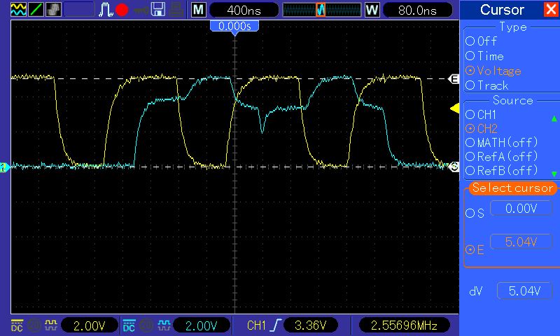 Hier der Schematic. Die Adressleitungen A0-A10 gehen direkt per 33 Ohm Widerstand auf die DRAM Adressleitungen. Die Sache ist die, dass wenn ich jeweils nur einmal 4MB teste, es tage/nächtelang ohne jede Fehler durchläuft. Jetzt wollte ich zusätzlich eine weitere Bank ansprechen um auf 8MB zu kommen. Die Bankadress ist jeweils auf D0-D7 gelegt (vom Prozessor) 65816 und ist bei einem steigenden PHI2CLK gültig. In dem Fall werte ich nur D6 (lower / upper 4MB) aus gebe dann entweder den CAS/RAS Pärchen für die entsprechenden RAMs frei. Interessant ist auch, es läuft stundenlang problemlos, wenn ich schreibe und direkt wieder lese... nur wollte ich sicher gehen dass es keine Refreshprobleme gibt, und schreibe dann die kompletten 4MB bzw. 8MB mit einem Muster dauert einige Minuten und lese es dann erst nach Minuten wieder. Wie gesagt lower 4MB alles Prima, upper 4Mb mit wenigen Fehlern. Die zwei Spannungslevel ergeben sich durch die Mischung 5V nativ und 3.3V vom XC9536XL ... Was mich irritiert ist aber der Spike nach unten.