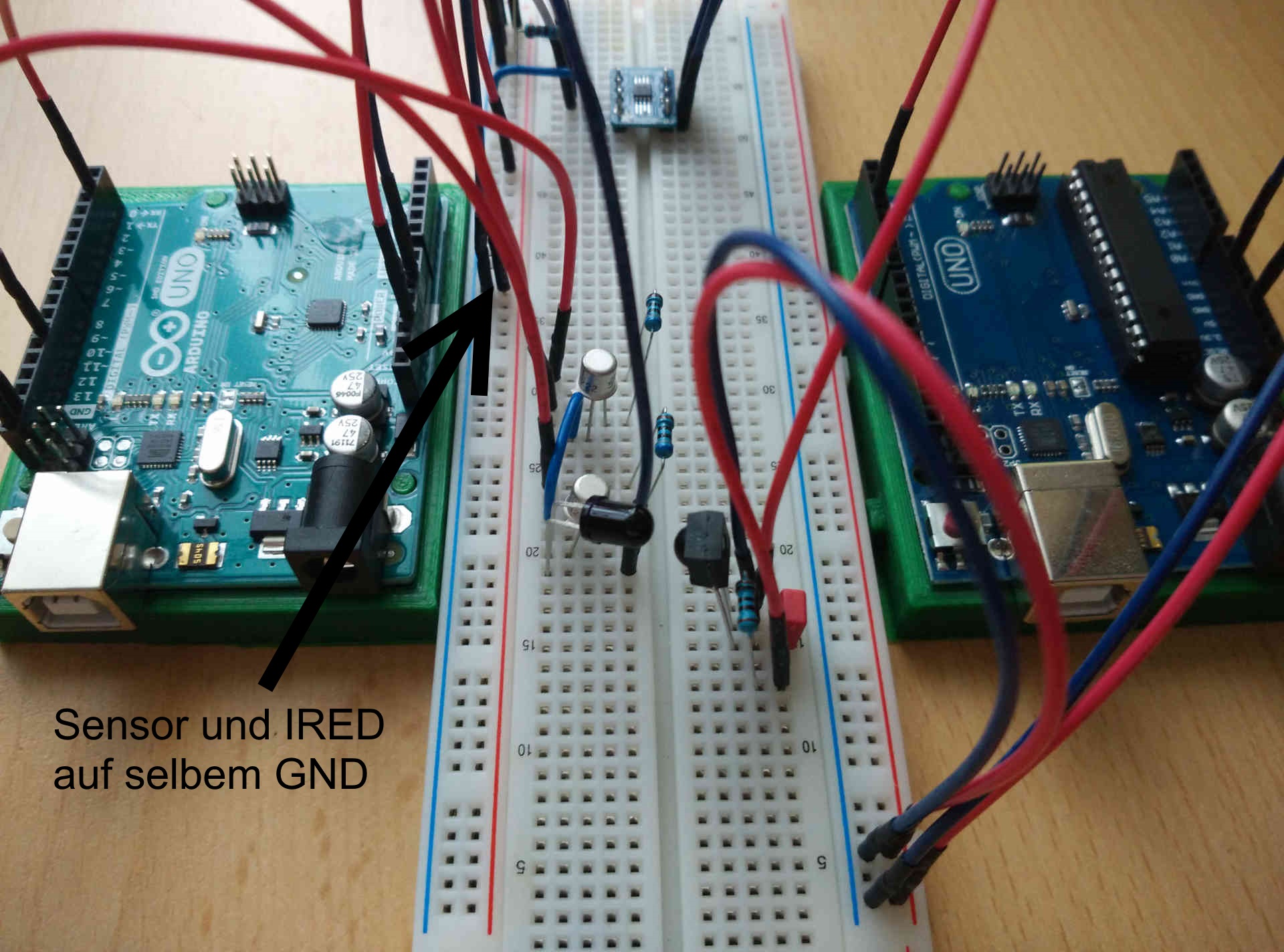 Grüße, ich habe gerade eine kleine Infrarotkommunikation aufgebaut bei der Temperaturdaten mittels I2C eingelesen werden und dann an einen zweiten Arduino übertragen werden. Das ganze funktioniert solange ich GND von Sensor und IRED getrennt lasse. Andernfalls werden die Temperaturwerte korrumpiert (z.B. -0.06°C bei Raumtemp.). Die Frage ist jetzt wodurch genau der I2C Bus vom normalen arbeiten abgehalten wird? Ich vermute durch die Belastung mit der hohen Frequenz von 38kHz oder durch den Strom (ca. 120mA) der gegen GND fließt.