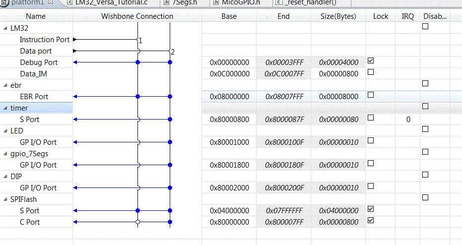 Hi, ich versuche mich gerade mit dem Mico32 auf dem Lattice Versa-Board. Die ersten Schritte sind soweit getan. Nun möchte ich in Abhängigkeit der Dip-Schalter die LEDs unterschiedlich zum leuchten bringen. Die Mico-Config mit den Adressbereichen ist in "MSB.gif" zu sehen. Das C-File: "LM32_Versa_Tutoral.c" Wenn ich das generierte .elf-File im Debug-Modus einspiele, so erhalte ich in der Console folgende Meldungen: found GPIO instance named LED found GPIO instance named gpio_7Segs found timer instance timer found dip switches DIP testselect:-16777216 testselect:-16777216 testselect:-16777216 testselect:-16777216 testselect:-16777216 Anscheinend wird der DIP-Switch gefunden, totzdem scheint der Funktionsauftruf MICO_GPIO_READ_DATA(dip, test_select); einen Wert zu liefern, den ich so nicht verstehe, sieht nach einem Überlauf/Unterlauf-Wert aus. Der Funktionsaufruf ist als #define in der Datei "MicoGPIO.h" zu finden: /* ******************************************** ******************************************** MACROS FOR ACCESSING GPIO REGISTERS ******************************************** NOTE: FOR THE MACROS, THE FOLLOWING RULES APPLY: X is pointer to a valid MicoGPIOCtx_t structure Y is unsigned int variable */ /* reads data register */ #define MICO_GPIO_READ_DATA(X,Y) \ (Y)=((volatile MicoGPIO_t *)((X)->base))->data Kann mir jemand sagen, wieso das Lesen der DIP-Schalter-Stellungen nicht klappt? Grüße, Noro