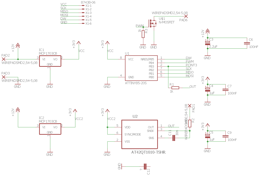 Hallo zusammen, ich stehe mit meinem aktuellen Projekt vor einem Rätsel. Ich versuche eine normale, 2m lange Aluleiste, die dazu vorgesehen ist LED Stripes unterzubringen, als ein Touchsensor zu benutzen. Dazu habe ich die angehängte Schaltung mit einem QT1010 und einem Attiny aufgebaut. An ein direktes einkleben der LED Stipes ist nicht zu denken, die QT1010 Dokumentation empfiehlt einen bypass Kondensator für kleinere Abstände zwischen LED und touch-Fläche. Also habe ich in die Leiste noch eine Schicht Pappe reingelegt, die ist ein paar mm dick. Die LED auf die Pappe geklebt und losgeht's. Die LEDsripe zieht sich bei 12V um die 1.8A. Attiny reagiert auf ein Interrupt vom QT1010 und schaltet einen NFET und je nach Zeitabständen des Berührens entscheidet dann auf EIN, AUS oder stellt die PWM Pulsebreite in 3 Stufen hoch. Angeschlossen an einem dicken Labornetzteil funktioniert alles einwandfrei. Dazu musste ich lediglich C11 anpassen. C12 war auf der Platine nicht belegt. Perfekt dachte ich. Nun, mit einem kleineren Schaltnetzteil (LED Spannungsquelle aus China) funktioniert das ganze schon mal gar nicht, dazu war die Last zu klein wenn die LEDs nicht an sind und das arme Netzteil wusste nicht was es tun soll. Nun probiere ich mit einem kleinen Trafo-Netzteil für Halogenlampen, welches ich gleichrichte und mit 2 Elkos glätte. Das einschalten der LEDs per Touch funktioniert, aber sobald durch die LEDs Strom fließt, verhält sich das ganze sehr komisch. Meistens geht das Umschalten nicht mehr. Dann habe ich angefangen zu experimentieren und den Strom zu LEDs und zurück nicht durch die Platine fließen lassen, um evtl. Störungen von der Masse Plane vorzubeugen. Keine Verbesserung. Einen zusätzlichen 5V Regler vor die 3.3V LDOs gesetzt, womit die Spannungsversorgung stabiler wurde (beim Einschalten der LEDs). Keine Verbesserung. Den C12 belegt und 10pF, 22pF, 44pF ausprobiert. Keine Verbesserung. Wenn ich aber mit der anderen Hand (oder Fuß) den Minuspol (oder auch Plus) am Gleichrichter oder LED-Zuleitung berühre, funktioniert alles einwandfrei. Deswegen denke ich, es wird wohl etwas mit Störungen zu tun haben. Aber, wieso funktioniert es mit einem Labornetzteil richtig? Hat hier jemand schon was ähnliches gebastelt oder ausprobiert? Ich habe einige Beiträge zum Thema QT1010 gefunden, aber keinen mit meiner Anwendung. Vielleicht habe ich etwas übersehen oder habe einfach einen Denkfehler. Danke schon mal an alle die ihren Senf dazugeben. Viele Grüße, Martin
