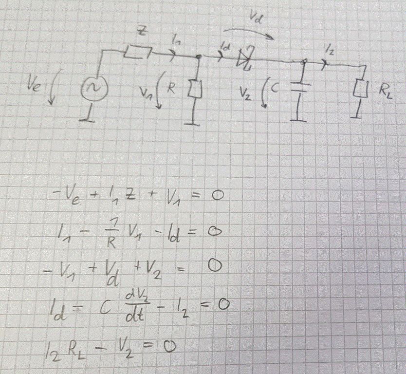 Ich würde das ja gerne einmal vorrechnen, aber bin gerade unterwegs mit dem smartphone. Also das aufstellen des dgl gleichungssystems ist eigentlich immer gleich. Man braucht alle unabhängigen maschengleichungen (da hilft es vllt die massepunkte zu verbinden), alle unabhängigen knotengleichungen und jeweils die u-i-relationen der zweige. Für die diode würde ich da Id = Is * exp(Ube/Ut) nehmen, das reicht als näherung. Bei dem kondensator gilt I = dQ/dT = C * dU/dt. Man kann die spannung auch als integral über den strom angeben, aber das ist bei einer gewünschten dgl form unhandlich. Auf diese weise erhältst du erstmal ein gekoppeltes nichtlineares dgl system. Man kann das dann noch durch umstellen und ineinandereinsetzen minimieren. Wie man das dann mit octave löst weiss ich aber nicht