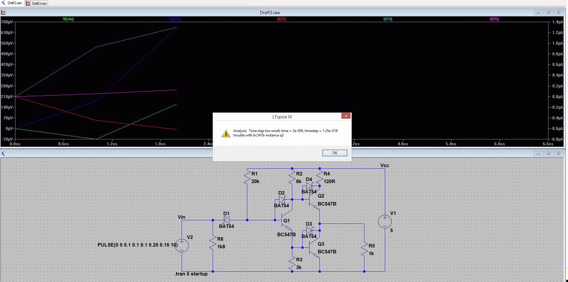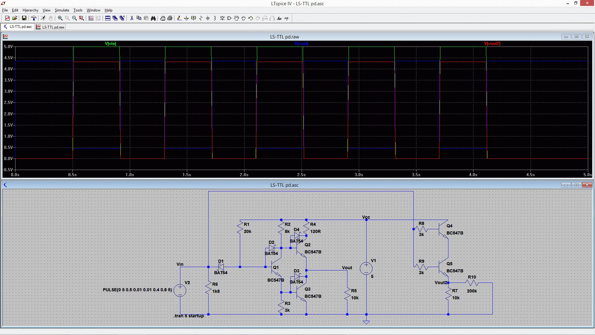 Dietrich L. schrieb: > Mike B. schrieb: >> Muss dann dieser Output nicht erst wieder auf ein sauberes Inputlevel >> für die nachfolgenden Stufen hochgesetzt werden? > > Nein, denn der erforderliche High-Pegel am Eingang ist kleiner als der > minimale High-Pegel am Ausgang. > > Beispiel der High-Pegel bei LS-TTL: > - der Eingang muss mindestens 2,0V sein > - der Ausgang liefert mehr als 2,5V bei max. Last (10 LS-TTL-Eingänge) > > Gruß Dietrich Ich habe bzgl. der LS-TTL mal die Totem-Pol-NAND-Schaltung aus http://www.elektronik-kompendium.de/public/schaerer/pullr.htm in LtSpice nachgebaut, um mir die Spannungsverläufe anzuschauen. Irgendwie will die noch nicht. Als Inputsignal verwende ich eine gepulste Spannungsquelle über dem PullDown-R. Was ist daran falsch?