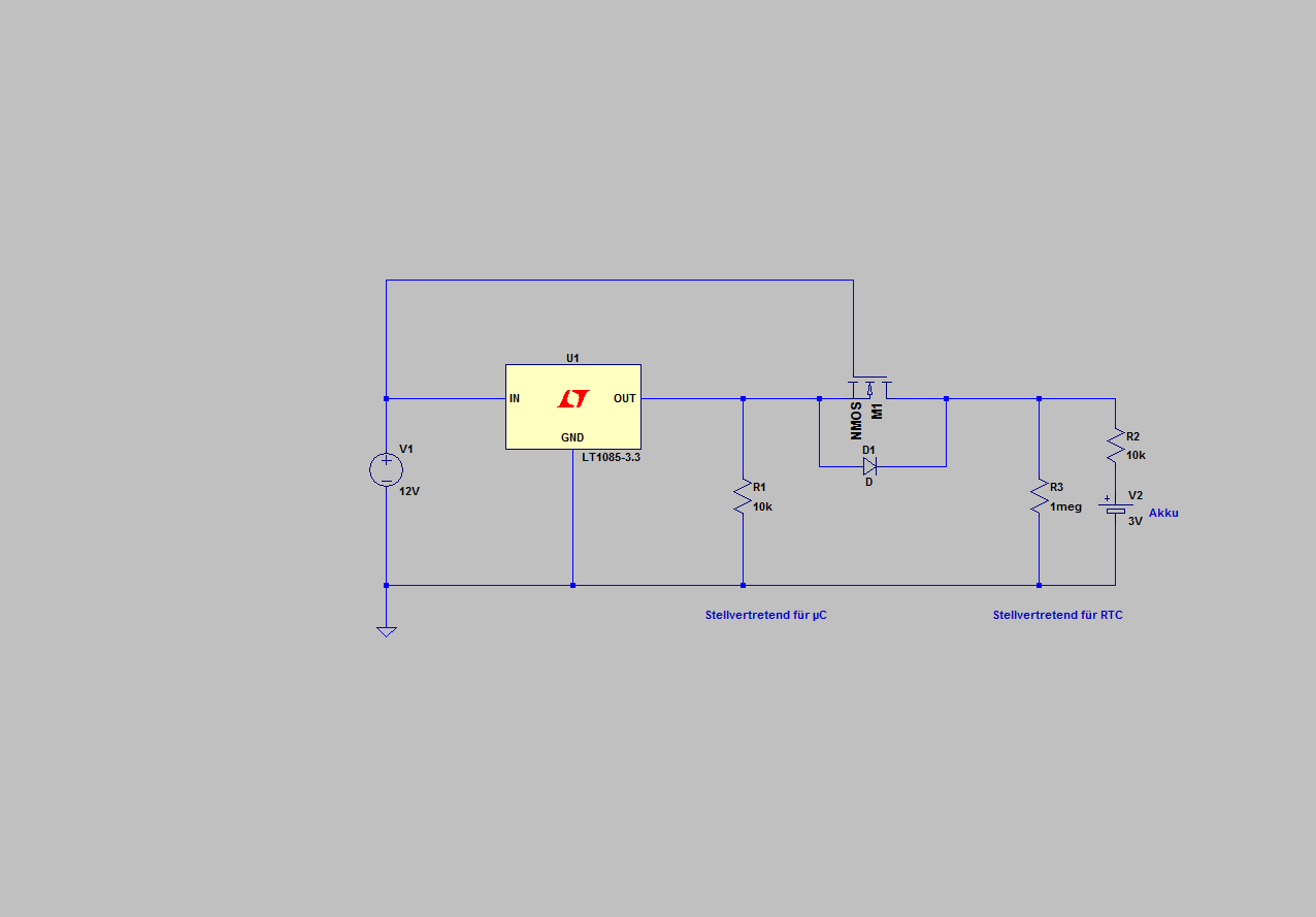 Also nochmal etwas ausführlicher, ich habe nochmal ein Bild angehängt. Ich hatte das ganze etwas abstrahiert, nun etwas genauer. Die Body Diode habe ich mal mit eingezeichnet. Ich hatte das Problem, das der µC Teil, hier dargestellt durch R1, Strom aus dem Akku der RTC zieht, wenn die 3V bzw. 12V ausfallen. Also wollte ich abschalten, ja ich weiß eine Diode hätte auch gereicht. Ich habe es aber so gelöst. Ist die 12V Versorgung vorhanden wird der RTC Teil über den Mosfet und die Bodydiode versorgt. Wird die 12V abgeschaltet, sperrt der Mosfet sofort. So der Plan. Das funktioniert auch soweit. Doch dann entdeckte ich den Spannungsanhub und dachte mir "verrückt". Konnte ich mir nicht erklären und habe eine Schaltung nur mit Mosfet 12V und zwei Widerständen aufgebaut(Bild im ersten Posting, die 3V waren nur Informativ). Das Ergebnis ist gleiche. So, also kein Troll einfach nur jemand sich etwas nicht erklären kann und auf Hilfe vom Forum hofft. @Falk Der Widerstand ist in Serie zum Gate. 12V-R-Gate.