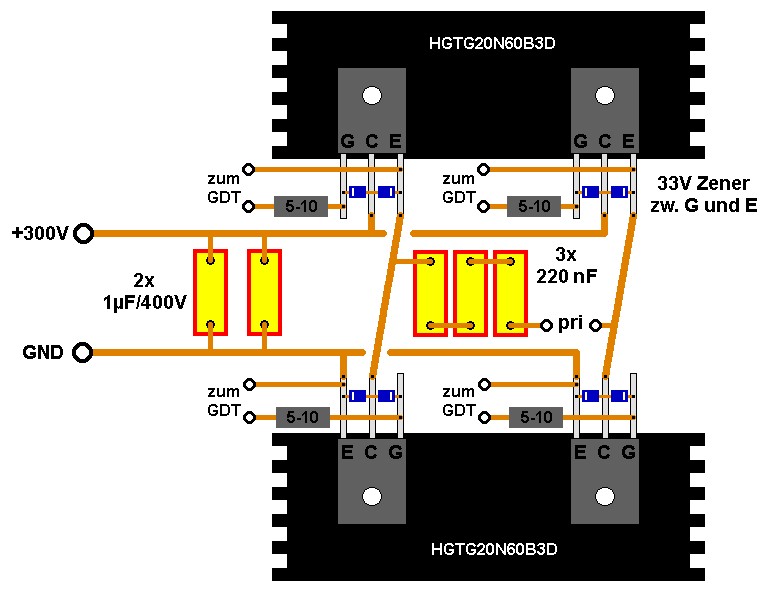 Christoph E. schrieb: > Ich habe mir schon 2 > IGBT's zerschossen Naja. Die Schaltung ist schon sehr einfach gehalten. Das sind nur 4 Sekundärwicklungen auf einem Ringkern. Damit werden alle vier IGBTs gleichzeitg geschaltet. Und das bei DEN Frequenzen von 314kHz? Das halte ich für SEHR gewagt. Erstens gibt es keinerlei Schaltung, um eine Totzeit der Brücken zu garantieren, das basiert alles auf gut Glück der unsymmetrischen Ein/Aus Zeiten der IGBTs. Aber die schalten schneller ein als aus, man braucht es eigentlich anders herum! Außerdem sind 314 kHz für die meisten IGBTs zuviel, auch für die relativ neuen Typen. MOSFET sind hier deutlich besser, weil schneller, vor allem beim Abschalten. Die höheren Leitverluste sind nebensächlich. Und zweitens ist dein Aufbau teilweise nicht so ganz HF-tauglich. Verdrillte Kabel vom Ringkern zu den IGBTs sind zwar gut, aber erstens zu lang und zweitens ist die Schleife der beiden Kabel am IGBT zu groß. Und warum in aller Welt nimmst du als Gatewiderstand diese Monster? Die sind erstens mechanisch zu groß, wodurch die Einkoppelschleife vergrößert wird und zweitens sind das gewickelte Widerstände, die einige (Dutzend?) uH Induktivität haben. Gerade DIE willst du dort nicht haben. Nimm normale 1W, ggf. 2W Widerstände, die reichen locker.