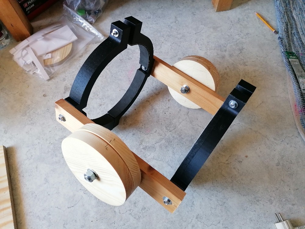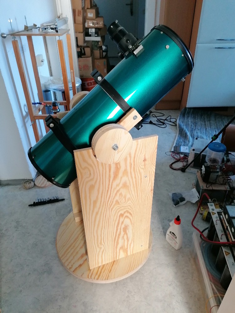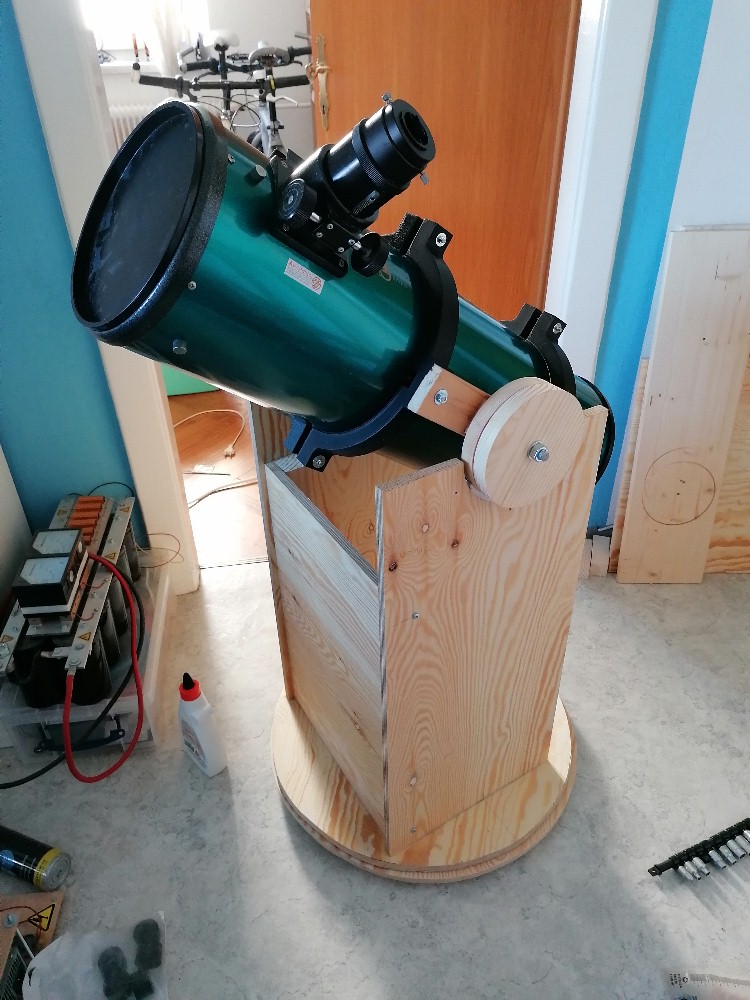 So, der Dobson-Umbau meines Newtonteleskops ist fertig. In den letzten Tagen konnte ich die beiden Holzscheiben ausschneiden, die Teflonlagerung montieren und die Rohrschellen mit den Holzzylindern verbinden. Mehr Information zum Bau: https://stoppi-homemade-physics.de/ausruestung/ Günstig war dieses Projekt aber nicht gerade. Die 3d-gedruckten Rohrschellen kosteten 85 Euro, das Holz ebenfalls ca. 85 Euro und dann musste ich noch Lochsägen, Gummifüße und das 4 mm dicke Teflon besorgen. In Summe werden es daher um die 200 Euro gewesen sein. Ich hoffe aber damit nun deutlich einfacher mit meinem 8 Zoll Newton visuell beobachten zu können. Die schwere Skywatcher HEQ-5 Montierung war mir viel zu schwer und sperrig. Die Rockerbox stellt man einfach auf den Boden und schon kann die Beobachtung beginnen. Ob sich dies in der Praxis aus so bewahrheitet wird sich zeigen...