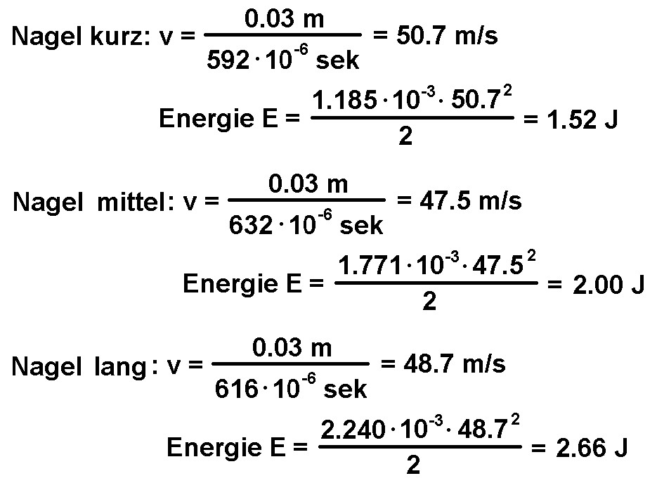 Zur Zeit arbeite ich einige ältere Experimente für Youtube auf, darunter auch meine Coilgun. Der Schaltplan stammt von Thomas Rapp (https://www.rapp-instruments.de/accelerator/Coilgun/coilgun.htm), den wohl genialsten Experimentator im deutschsprachigen Raum. Seine Projekte und Bücher sind einzigartig... Mit meiner Doppellichtschranke habe ich zunächst die Geschwindigkeiten von 3 unterschiedlichen Projektilen bestimmt. Ich komme beim längsten Nagel lediglich auf eine Geschwindigkeit von 50 m/s, was einer Energie von bescheidenen 2.7 J entspricht. Das hört sich jetzt nicht viel an, dennoch hat der beschleunigte Nagel ordentlich Wumms... Eine Getränkedose und die anschließende 3 cm dickte Dämmplatte durchschießt er mühelos und steckt dann danach gut 1 cm im Holz. Mir reicht dies eigentlich aus. Mit geschickter Positionierung der beiden Lichtschranken kann man bestimmt noch einiges herauskitzeln. Bei einer Ladespannung von 275V beträgt die in den Kondensatoren gespeicherte Energie ca. 400 J. Der Wirkungsgrad beträgt demnach lediglich 0.7%. Am Tag der offenen Tür kam dieser Versuch beim jungen Publikum aber dennoch immer sehr gut an. Es muss einfach krachen oder blitzen ;-) Mehr Informationen: https://stoppi-homemade-physics.de/coilgun/