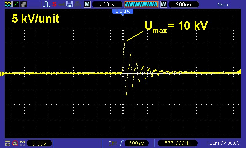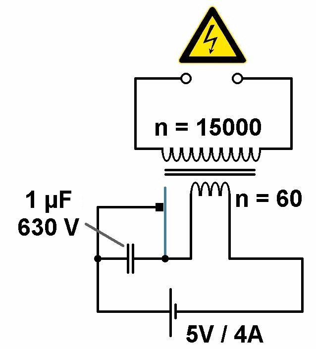 @Torsten: Danke für deine Hinweise aber Ich ändere ja nichts an der Frequenz der Primärseite der Teslaspule, diese bleibt ja unverändert bei 4 MHz. Was ich ändere ist die Resonanzfrequenz der Sekundärspule, damit diese im Betrieb mit Funken ebenfalls bei 4 MHz liegt. Ich habe mir vor einigen Jahren gebraucht einen Funkeninduktor gekauft. Dieser liefert bei einer Eingangsspannung von ca. 6V Funken in der Länge von 12 mm. Nicht gerade berauschen aber immerhin. Nun hatte ich gedacht, ich probiere einen möglichst einfachen Funkeninduktor selbst zu bauen. Da ich aber keine Lust verspüre eine HV-taugliche Sekundärwicklung mit 80000 Windungen und mehr zu wickeln, kam mir die Idee, es einmal mit einer fertigen Trafo-Sekundärspule zu probieren. Auf kleinanzeigen entdeckte ich eine scheinbar passende mit 15000 Windungen. Für den Kern der Primärwicklung verwendete ich zunächst vier 4-Kant-Metallstäbe und dann dünne isolierte/ummantelte Eisendrähte. Für erste Versuche schloß ich die Primärspule manuell einfach an eine Gleichspannungsquelle (max. 30 V) an. Die induzierte Sekundärspannung zeichnete ich unter Verwendung einen einfachen 1000:1 Spannungsteilers mit dem Oszilloskop auf, also 1 V = 1 kV. Die ernüchternden Ergebnisse: Selbst bei einer Gleichspannung von 30V und wirklich nicht mehr vielen Primärwicklungen kam ich über 4 kV nicht hinaus. Auch eine elektronische Ansteuerung der Primärspule über ein PWM-Modul in Kombination mit einem Mosfet brachte keine Verbesserung. So kann ich mir natürlich meinen Wunsch, mit dem selbstgebauten Funkeninduktor Funken in der Größenordnung von 1 cm (= ca. 10 kV) zu erzeugen, aufzeichnen. Oder hat jemand von euch eine andere Idee für eine möglichst einfache Umsetzung (eventuell mit meinem Setup unter Verwendung der 15000-Windungen-Spule)? Mehr Informationen: https://stoppi-homemade-physics.de/funkeninduktor/