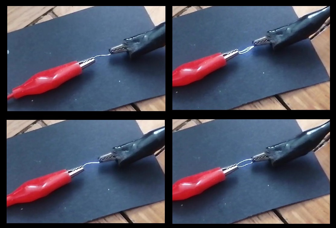 Danke Peter für den link, den kannte ich noch nicht. Ich klopfe auch auf den Boden, um die beiden golddrähte zu trennen. Komischerweise geschieht die Trennung in diesem Fall deutlich langsamer als bei mir (20 mikrosekunden/div im verlinkten Experiment gegenüber 400ns/div bei mir). Meine beiden 0.1 mm golddrähte sollten eigentlich auch hochrein sein. Ich werde mich der Sache nochmals annehmen und die Spannung am 10 kOhm vorwiderstand abgreifen (bisher am 100 ohm vorwiderstand bei mir). Auch die Orientierung der beiden golddrähte werde ich noch ändern. Bei mir sind sie eher horizontal ausgerichtet, im link hingegen vertikal... Beim trennen der golddrähte bilden sich nanokanäle ähnlich dem in die Länge gezogenen Käse, wenn du dir ein pizzaeck aus einer Pizza nimmst. Und in diesen Fällen ist der leitwert nicht mehr von der Geometrie (Länge, Querschnitt) abhängig sondern ist quantisiert und besitzt den leitwert 1/12900 ohm^-1. Bei mehreren solcher Kanäle parallel halt dann n/12900 ohm^-1...