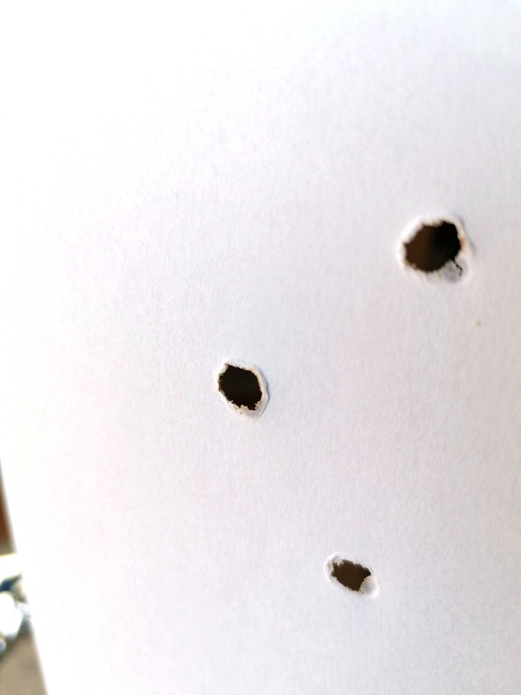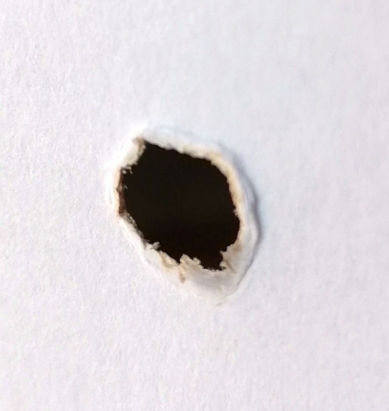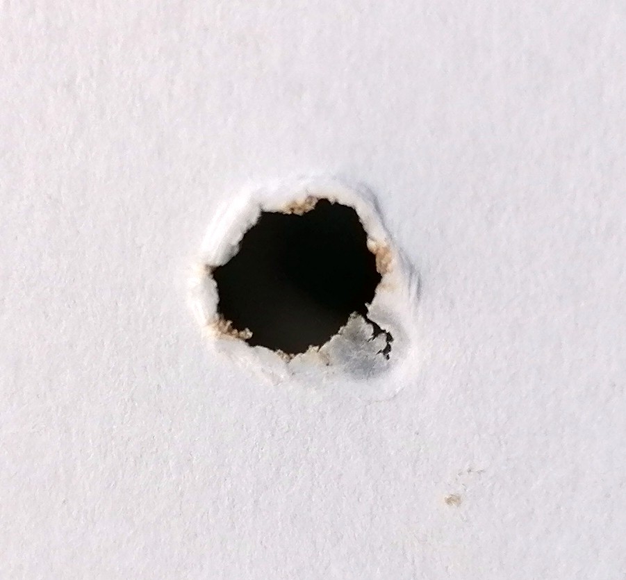 Christoph E. schrieb: > Der Laserpunkt ist schön rund aber nicht extrem hell. Wenn man die Einschussstelle stark vergrößert und mehr Kontrast drauf gibt, dann sieht es so aus, als ob der Laser bei der Deutschen Bank eine 200mm starke Tresortür aus Stahl zum Schmelzen bringt.