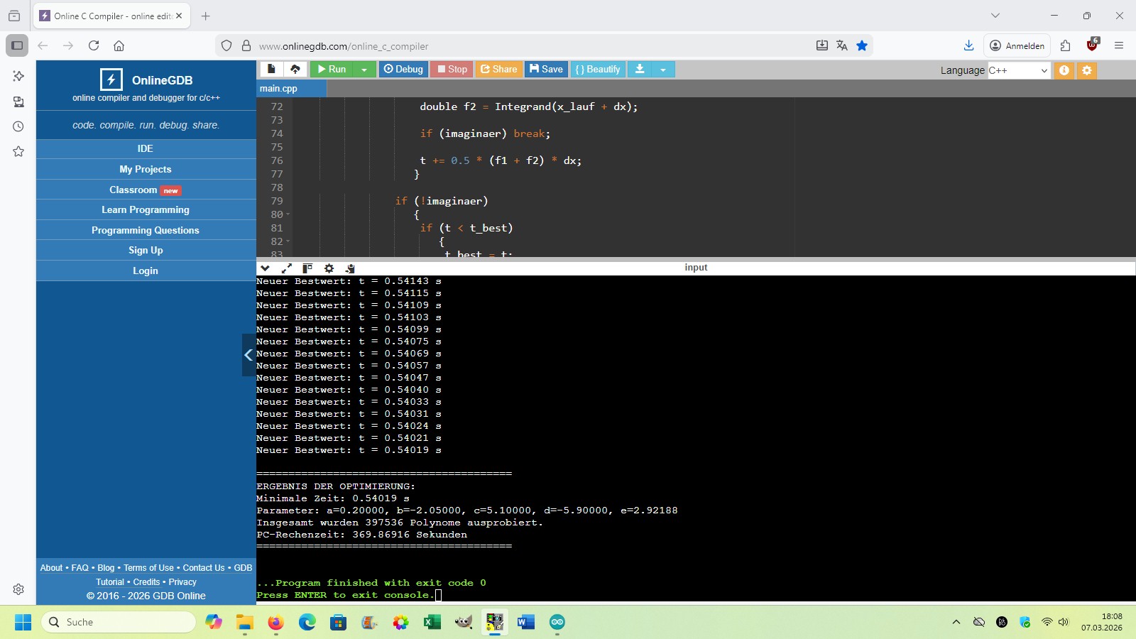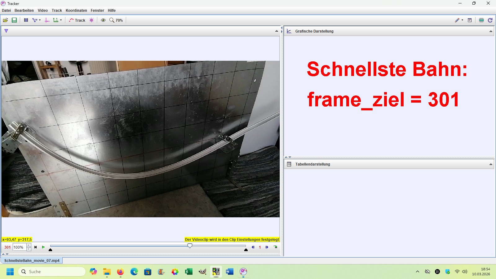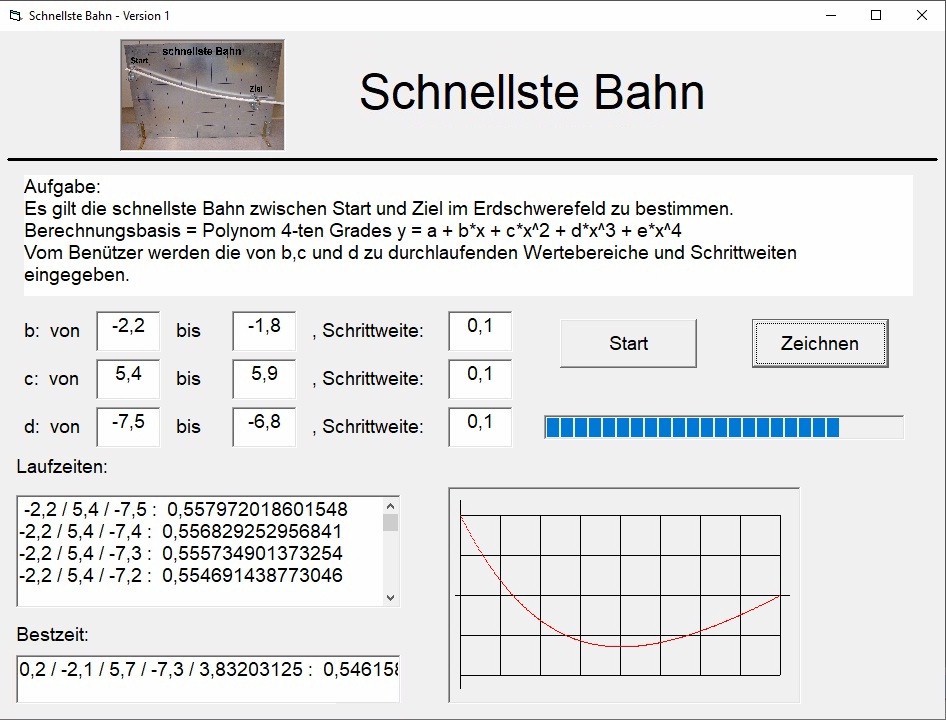 Für das Physiklabor habe ich auch eine verstellbare Kugelrollbahn gebastelt. Ziel ist es, die Bahn bei gegebenen Startpunkt (0/0.2m) und Zielpunkt (0.8m/0) so zu verändern, dass die Kugel die kürzest mögliche Laufzeit besitzt. Zuerst geschieht dieser Versuch experimentell und dann auch noch rechnerisch mit meinem einfachen und uralten Visual Basic Programm. Hierfür werden die Koeffizienten eines Polynoms 4ten Grades innerhalb einzugebeneder Grenzen variiert und für jedes Polynom dann die Laufzeit theoretisch berechnet. Am Ende werden dann die Koeffizienten der schnellsten Bahn ausgegeben und diese Bahn gezeichnet. Die Koeffizienten a und e sind nicht frei wählbar, da ja die Bahn durch den Start- und Endpunkt verlaufen muss. Der Koeffizient a ist daher 0.2 und e ergibt sich aus b, c und d. Diese theroetisch ermittelte "beste" Bahn wird dann in das gleiche Diagramm wie die experimentell ermittelte Bahn eingetragen. Im Idealfall unterscheiden sich beide Bahnen nur geringfügig voneinander... Mehr Informationen: https://stoppi-homemade-physics.de/schnellste-bahn/