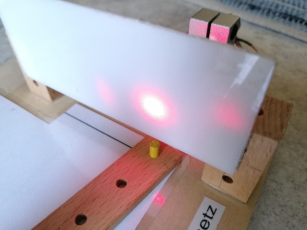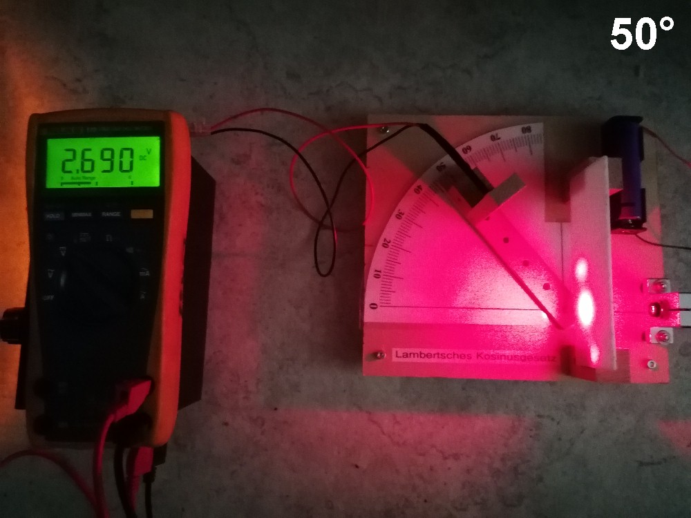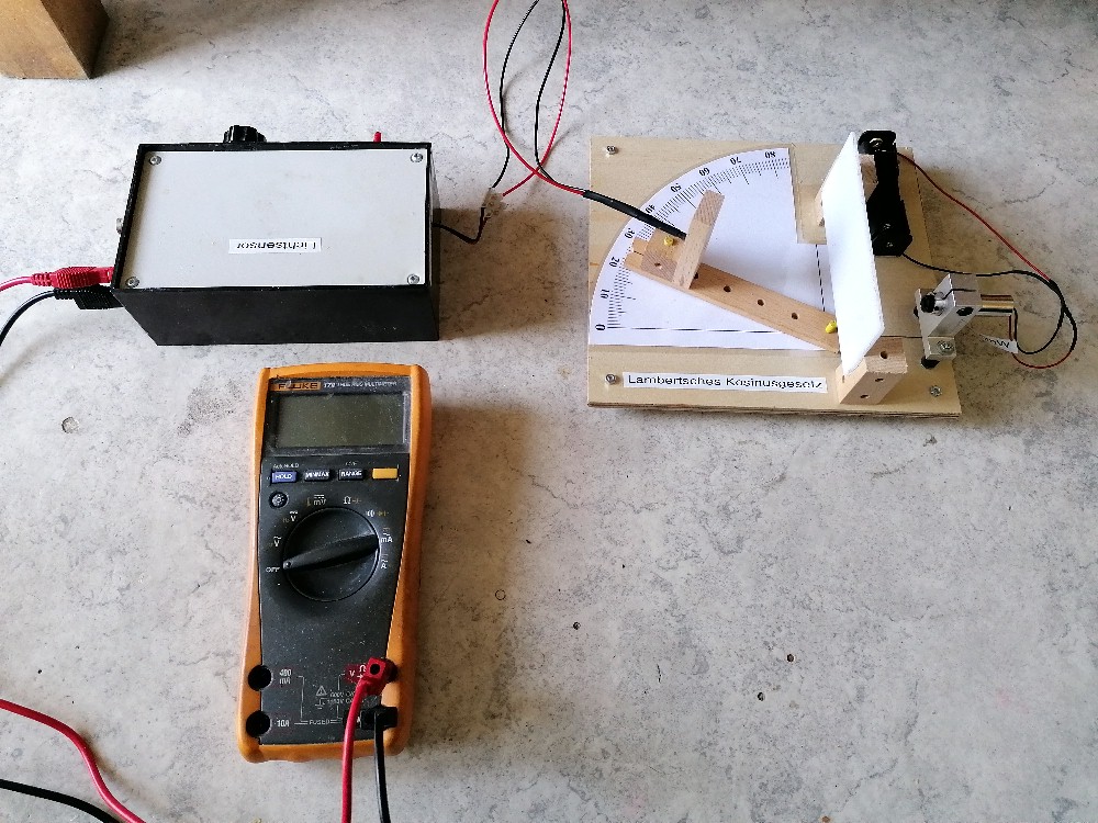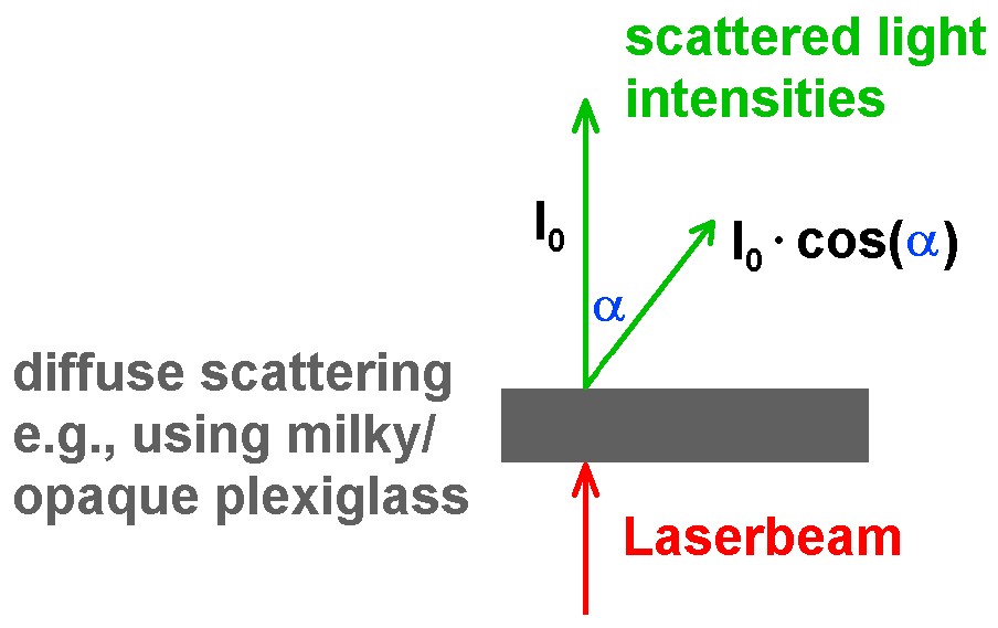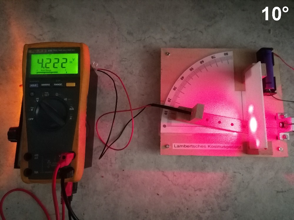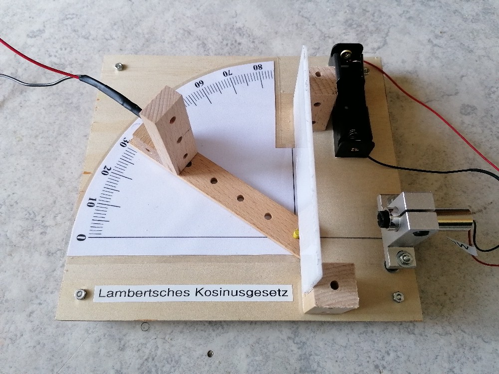 Versuch zum Lambertschen Strahlungsgesetz/Kosinusgesetz (nicht zu verwechseln mit dem Lambert-Beerschen-Absorptionsgesetz!). Beleuchtet man eine milchige Platte mit einem Laser, so folgt aufgrund der diffusen Streuung die Intensität hinter der Platte dem Lambertschen Kosinusgesetz I(alpha) = I0 * cos(alpha). Senkrecht zur Platte ist also die Intensität maximal, nimmt dann mit zunehmenden Winkel ab um bei alpha = 90° (streifender Blick) auf 0 gesunken zu sein. Für den Aufbau verwendete ich u.a. Holzteile der österreichischen Firma MATADOR. Mit diesen habe ich schon als Kind gespielt/gebaut. Laser und Lichtdetektor (TIA mit der Photodiode SFH203) hatte ich noch im Fundus. Achtung: Wenn man keine punktförmige sondern eine flächige Lichtquelle hat, so erfasst die Photodiode mit ihrem Öffnungswinkel mit zunehmenden alpha eine immer größer werdende Fläche gemäß 1/cos(alpha). Genau dieser Faktor würde dann den Lambertschen Faktor cos(alpha) kompensieren und man würde keine abnehmende Intensität mit zunehmenden alpha feststellen. Daher verwende ich auch einen nahezu punktförmigen Laser für dieses Experiment...