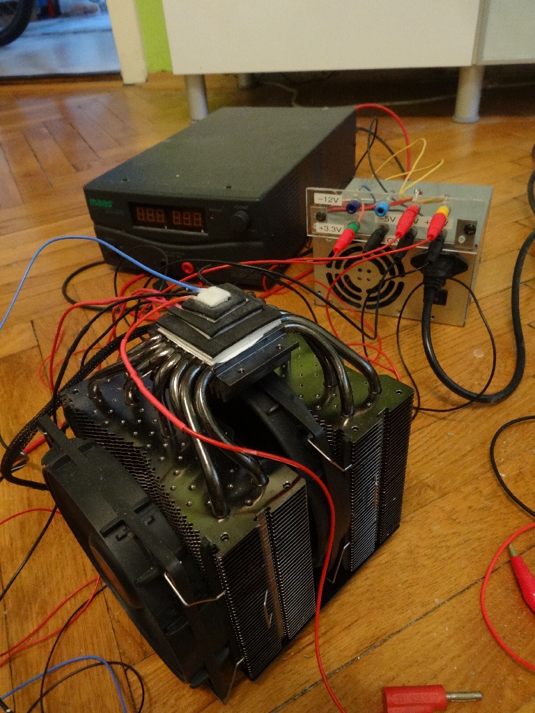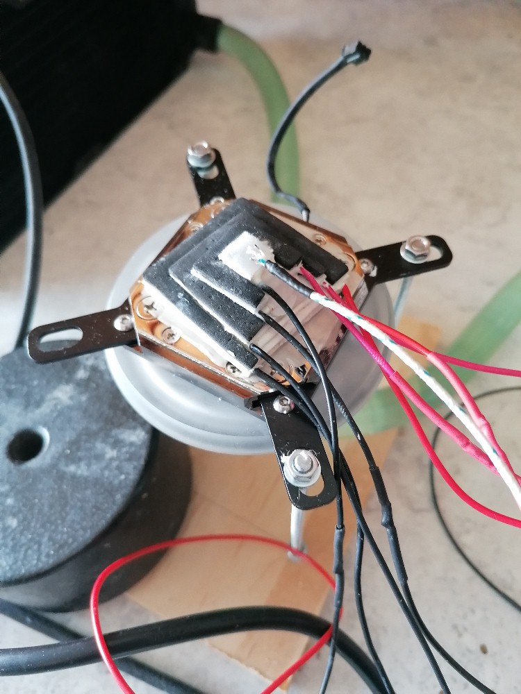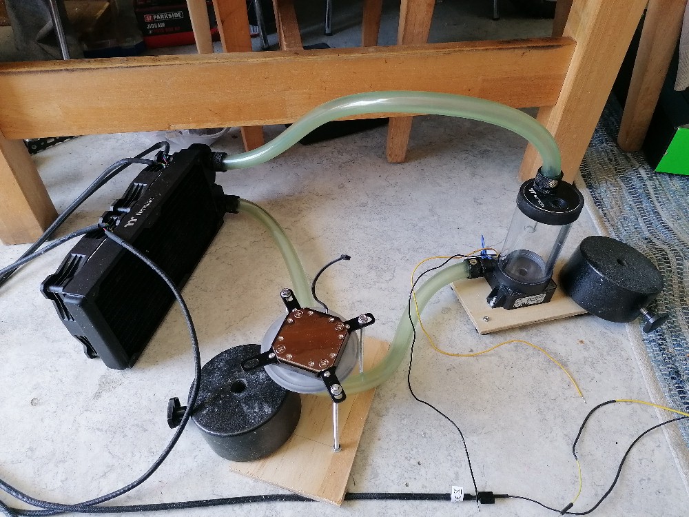 Vor ca. 5 Jahren hatte ich mit einem großen Heatpipe-CPU-Kühler und Peltierelementen bereits versucht, sehr tiefe Temperaturen zu erzielen. Als Heatpipe-CPU-Kühler kam ein Bequiet Dark Rock Pro 3 mit 250W TDP zum Einsatz. Damit konnte ich -64 °C erzielen, allerdings im Jänner auf dem Balkon, in der Wohnung waren es damals -62.4 °C. Einige Zeit davor hatte ich es schon einmal mit einer CPU-Wasserkühlung H100i von Corsair probiert, leider ging dann sehr schnell die Pumpe kaputt. Vor zwei Wochen packte mich dann wieder der Ehrgeiz, es nochmals mit einer Wasserkühlung zu probieren. Auf der österreichischen Verkaufsplattform willhaben bin ich sogleich auch fündig geworden: Eine Corsair H100i elite um nur 7 Euro direkt bei mir in Graz, da musste ich zuschlagen. Im Verkaufstext stand, dass die Kommunikation mit der Kühlung nicht mehr funktionierte. Alles aufgebaut und die Lüfter mit 12V und die Pumpe mit 12V und 5V versorgt. Leider schien die Pumpe nur schwach zu arbeiten, denn das Ganze zog bei 12V nur 0.3A. Da die Kommunikation tot war, konnte ich vom PC auch nicht die Pumpenleistung erhöhen. Der erste Versuch war leider ernüchternd: Die Pumpe schien eben fast nicht zu arbeiten und so erzielte ich nur ganz kurz lediglich -35 °C und der Kühlkopf wurde extrem heiß. Dies war dann der Todesstoß für die Pumpe... Der Ansatz es mit einer geschlossenen Kompakt-Wasserkühlung zu probieren missglückte also zweimal. Aufgeben wollte ich an der Stelle aber auch nicht. Daher sah ich mich nach einer offenen custom-Wasserkühlung um und fand bald eine gebrauchte Thermaltake Pacific C240 um nur 84 Euro inkl. Versand. Deren 12V/18W Pumpe ist erstens viel leistungsfähiger als jene im Kühlkopf integrierte und zweitens ist sie extern und kann demnach nicht durch Überhitzung so leicht sterben. Gestern das Ganze wieder in der Küche aufgebaut und die Pumpe einmal einige Zeit laufen lassen, damit die Luftblasen in den Schläuchen verschwinden. Dann mein 4-stufiges Peltierelement mit Wärmeleitpaste montiert und einen Versuch gestartet. Leider kam ich nach einigen Anläufen minimal nur auf -55.8 °C. Ehrlich gesagt war ich ziemlich enttäuscht, denn ich hätte erwartet, dass die Wasserkühlung dem Heatpipe-Kühler überlegen ist. Gehofft hatte ich ja etwas um die -70 °C. Jetzt ist die Frage, ob ich den 4-stufigen Peltierstack oben noch mit einem winzigen 5x5 mm Peltierelement erweitere. Das jetzige oberste Element, ein 0703, misst 10x10 mm. Dieses kann aber nur sehr wenig Wärme abführen und daher befürchte ich, dass es mit dem zusätzlichen 5x5 mm Peltier darüber überfordert wäre. Zudem kostet mich das Spezialpeltierelement wohl um die 35 Euro... Hat von euch vielleicht jemand ein 5x5 mm Peltierelement, welches er mir günstig verkaufen könnte? Es kann auch gut sein, dass all meine verwendeten Peltierelemente einen nicht perfekten Wirkungsgrad haben, da sie auf aliexpress oder ebay oft nur wenige Euro gekostet haben. Da gibt es ja preislich extreme Unterschiede zu anderen Anbietern. Ob diese dann qualitativ auch so viel besser sind und arbeiten kann ich nicht beurteilen. Mehr Informationen: https://stoppi-homemade-physics.de/hoch-und-tieftemperaturen/
