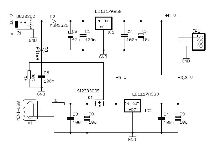 Hallo, auf wwww.netzmafia.de findet man unter dem Stichwort "Spannungsumschaltung" den angehängten Schaltplan. Wenn am Steckerer ein Netzteil angeschlossen ist und dieses mehr als etwa 8V liefert, soll die Spannungsversorgung über die USB-Buchse gesperrt sein. Fällt das Netzteil aus oder wird abgesteckt, soll der SI2333 leitend werden und z.B. ein PowerPack an der USB-Buchse kann die Spannungsversorgung übernehmen. So das Ziel. Jetzt mein Problem. Bei eingesteckten Netzteil und einem Uin von mehr als 5V gilt doch UGS >0V, z.B. bei 8V dann UGS = 3V. Nach Tabelle vom Datenblatt des SI2333 leitet der MOSFET dann. Aber gerade dann soll er doch sperren?! Oder? Und wenn das Netzteil ab ist sperrt der MOSFET SI2333. Und genau dann soll doch eigentlich Strom von der USB-Buchse Richtung 5V-Ausgangspin , bzw. 3,3V Spannungsregler fließen. Liege ich da falsch oder richtig? Ich verstehe es nicht. Mit besten Grüßen aus Limburg an der Lahn Marco Schramm