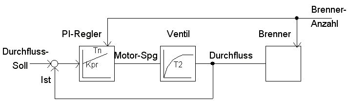 Jetzt sind ein paar grundsätzlich Dinge geklärt, aber es sind viele undurchsichtige Dinge dazu gekommen. + Durchflussregelung + PT1 der Strecke mit T=2,6sec Toni K. schrieb: > Realisiert in der Simulation über eine Subtraktion von Durchfluss > Soll(Sprung) und Durchfluss an den 6 Brennern. Dieses Ergebnis wird > integriert. Da sich das Ergebnis nachher rückkoppelt ist es also ein > Rückgekoppelter Integriere welcher ein PT-1 Verhalten hat. > Da ist das RV noch nicht mit berücksichtigt. - das geht jetzt völlig daneben. Ich hatte schon geschrieben, dass man zuerst nur die Strecke modelliert und daraus das Regelkonzept entwickelt und optimiert. Jetzt den Regler einzubeziehen und auch noch das RV wegzulassen, ist ein Gefrickel, das ich nicht nachvollziehen kann. + für mich bleibt es also bei einer PT1-Strecke Toni K. schrieb: > Der Differenzdruck über das RV bildet sich erst in > nach dem Integrator in der Simulation. Denn ich Integrieren einen > Durchfluss von l/s dann nach dem integrieren habe ich l also ein > Volumen. Durch eine Umrechnung erhalte ich den Druck nach RV. - wieder völlig unverständlich. Hier wird kein Volumen integriert. Der Regler integriert nur die Regelabweichung und steuert das Ventil. Der Differenzdruck bildet sich natürlich nicht durch Integration, sondern schon allein durch den statischen Durchfluss. - meine Frage nach dem D-Anteil in der Stecke hast du noch nicht erklärt. Liegt es nun am Druckabfall oder bleibt es bei einer PT1-Strecke, wie du sie jetzt beschreibst. Deine Betrachtungen zeigen mir, dass du nicht sauber die Strecke analysierst und immer wieder den Regler einbeziehst. Nur die Strecke ist entscheidend für das Reglerkonzept und die Optimierung. Deshalb weiß ich nicht, ob deine Strecke stimmt. Einen D-Anteil kann ich mir nur durch den beschriebenen Druckabfall erklären. Egal wie die Strecke nun aussieht. Die Durchfluss-Regelung sieht erstmal sehr einfach aus. Man optimiert den Regler einfach getrennt für jede Brennerbestückung. Die sich ergebenden Kpr- und Kn-Werte werden einfach entsprechend umgeschaltet. Siehe Anhang.