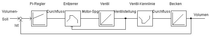 Ja, es tut mir leid, dann verstehe ich dich eben nicht. - Differenzbildung und Integrator habe ich nur im Regler gefunden. - Ein Integrator, der ein Volumen aufintegriert finde ich auch nicht. - Mit den 2 Strecken in denen Öl fließt kann ich so nichts anfangen. Ist vielleicht auch egal. Die Regelung scheint mir immer noch sehr einfach.
