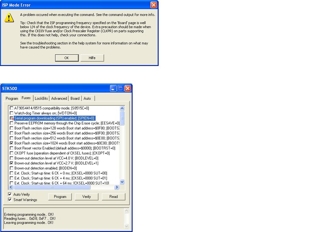Ich habe mal etwas experimentiert mit meinem STK 500 und habe die gleiche Meldung bekommen, wenn ich dem Controller den Takt weggenommen habe.