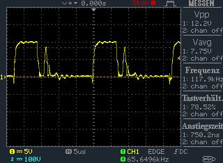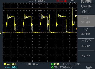 So, neuer Übertrager ist fertig Mit der Glühlampe als Last beträgt die Spannung 240V. Es fließen 183mA, macht 43,9W. Auf der Primärseite fließen 4,7A. Bei 12V sind das 56,4W. Es fallen also 12,5W Verlustleistung an. Wie im Bild "GATE.bmp" sichtbar, ist das Tastverhältnis jetzt nicht mehr permanent am Anschlag. Der Übertrager macht sich mit lautem Surren bemerkbar. Thomas B. schrieb: > hinz schrieb: >> Und was stört dich an den UF4007? > > Weil das das billigste ist was man bekommen kann. > Und eine BYW55/56 wäre passender, aber auch teurer. Ist das billigste immer das schlechteste? BYW54 hätte ich sogar da. Aber ist sie mit ihren 4µs t_rr nicht zu langsam? hinz schrieb: > Als nächstes kommen dann die Snubber dran... Das Oszibild "DRAIN.bmp" zeigt die Spannung am Drain von Q2. Die Snubberwiderstände haben übrigens 120Ω, die beiden Mosfets sind IRFB7446, keine IRF540. Das habe ich vergessen im Schaltplan zu aktualisieren.
