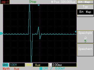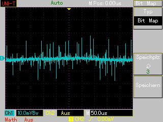 Ich habe noch eine Messung gemacht, bei denen ich unsicher bin, was ich davon halten soll. Und zwar wollte ich sehen, wie die Ausgangsspannung beim Ein-und Aus-schalten des Gerätes ansteigt und abfällt. Ich habe das Gerät auf 3,3V eingestellt und mit verdrillten Einzeladern zu je 50cm mit dem Oszilloskop verbunden. Außerdem habe die Gehäuse (Erde) beider Geräte mit einer dritten Einzelader verbunden. Zuerst zum Abfallen: Beim Ausschalten fällt die Spannung langsam bis auf Null ab. Keine unerwarteten Peaks. Aber beim Einschalten sehe ich Peaks. Dann sehe ich beim Einschalten folgende Bilder auf dem Oszilloskop: MAP004.BMP: Ohne Last. Ich sehe einen Peak mit etwas mehr als 4V in positiver und negativer Richtung. Danach steigt die Spannung ohne weitere Peaks innerhalb von 80ms bis zum Sollwert an. MAP005.BMP: Zeigt den "problematischen" Peak im Detail. MAP006.BMP: Mit 100nF parallel zum Oszilloskop. Der Peak ist viel kleiner. MAP007.BMP: Mit 100 Ohm Lastwiderstand parallel zum Oszilloskop. Der Peak ist annähernd genau so groß, wie ohne Widerstand. Da der Kondensator viel gebracht hat, dachte ich mir, ich löte ihn in das Netzgerät ein, und zwar direkt auf die Ausgänge der Platine mit der Endstufe, wo auch die dicken Transistoren drauf sind. Da hat er aber so gut wie nichts bewirkt. Und auch direkt parallel zu den Ausgangsklemmen des Netzteiles hat der Kondensator fast nichts bewirkt. Nur direkt parallel zum Eingang des Oszilloskops sehe ich eine gute Wirkung. Und das verstehe ich nicht. Habe ich Mißt gemessen?