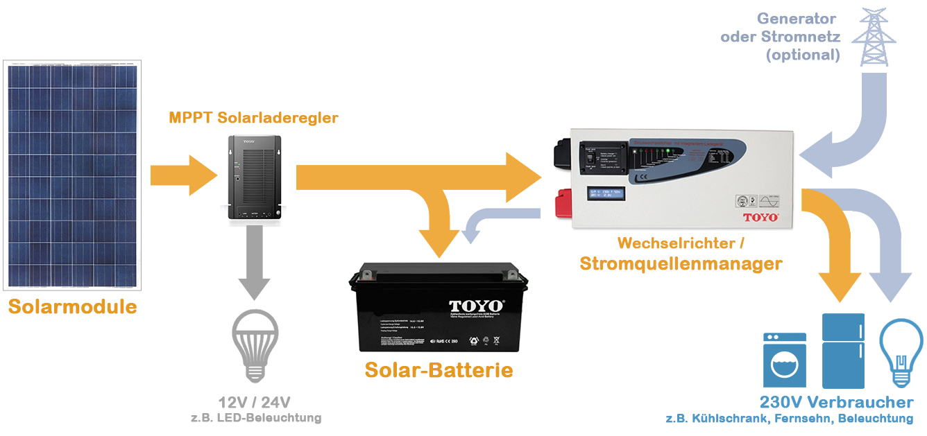 Bei uns ist folgende Solaranlage im Garten als Inselanlage aufgebaut: 6 x 100Wp Solarmodule mit jew. 4 nach Süden und 2 nach Westen ausgerichtet 1 x Solartronics Wechselrichter mit 3000 Watt 1 x 12V Bleibatterie 210Ah (AGM VRLA) und z.Zt. 2x 30A Solarladeregler Die Laderregler sollen ersetzt werden, weil sie nicht ihren Zweck wie gewünscht erzielen: Wechselrichter nicht an Lastausgang anschliessbar + Ladeschlussspannung zu hoch, was vermutungsweise zum schnellen Ableben der Batterie führt. Der Wechselrichter ist überdimensioniert (was damals noch erforderlich war), soll aber erst mal bleiben. Meine Frage(n) nun zum Laderegler: Es gibt Laderregler die pulsen den Ladestrom, also ein paar Sekunden wird eingeschaltet, dann wieder aus. So machen es zumindest die aktuellen Regler. (1) Meine Überlegung ist nun, dass das nicht optimal sein kann, weil die Solarenergie nur zur Hälfte genutzt wird. Und ob es nicht besser wäre so etwas wie einen "Analogregler" zu verwenden, der auf eine möglichst konstante Spannung regelt. Falls es so etwas gibt. Die Verschaltung der Solar-Module soll in Zukunft so erfolgen, dass alle Module über eine Shottky-Diode getrennt werden und dann alle parallel zu EINEM Regler geführt werden. Wenn möglich soll die Last (also der Wechselrichter) an den Solarregler angeschlossen sein. Um im Falle einer vollen Batterie und Sonne eben den Wechselrichter möglichst direkt zu versorgen. Wobei ich mir nicht klar bin, ob dies für die (2a) Schonung der Batterie bzw. die (2b) Reichweite bei ungünstigen Lichtverhältnissen viel aus macht. Also viele Fragen (1,2a,2b). Vielleicht könnt ihr mir helfen? Als Ergänzung noch: Mein "ideales" Ladekonzept würde so aussehen: - ein Laderegler der die Spannung konstant hält, - die Last wird einfach an die Batterie angeschlossen und sobald die Last die Spannung der Batterie zu stark nach unten zieht, regelt der Laderegler auf, ggf. auf 100%. Also im Grunde so wie im Auto.
