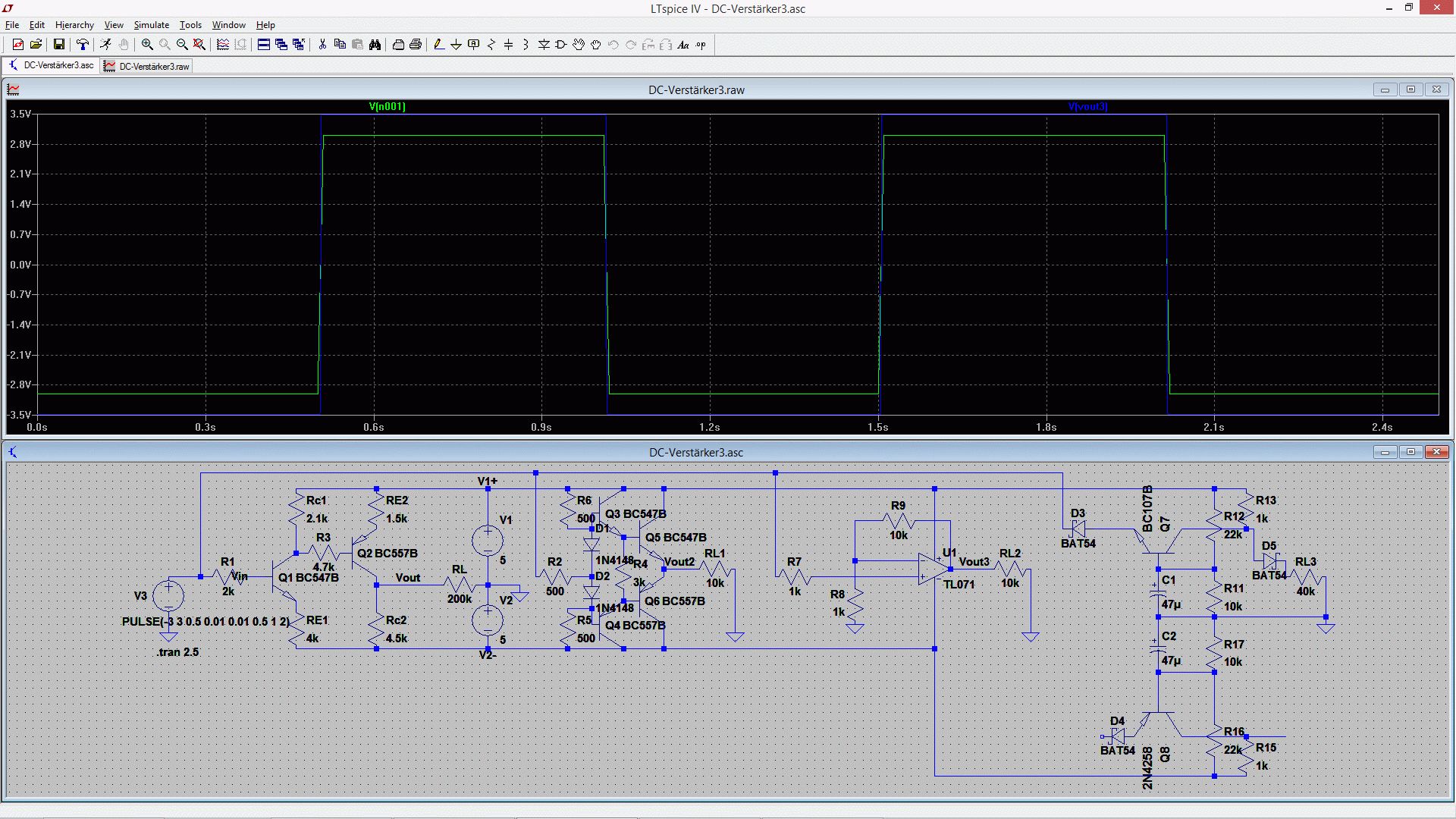 @matthias hatte ich im übrigen schon mal simuliert siehe Bild der Teil zwischen R7 und RL2 Wie man oben sieht bekommt man bei einer Spannungsquelle von +/-5V keine +/-5V (oder knapp darunter) als Ausgangspegel raus. @easylife auch das hatte ich bereits versucht ebenfalls siehe Bild Teil der Schaltung zwischen R2 und RL1 allerdings als Emitterfolger die Ausgangspegel liegen phasenrichtig bei +/- 0.6V ich sehe gerade, dass "damals" mein Kopierversuch von http://elektroniktutor.de/analogverstaerker/qu_kompl.html etwas daneben, denn der Q6 (V4 dort) ist bei mir falsch eingebaut muss ich nochmal umbauen in ltSpice Danke!