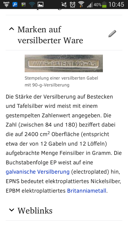Hi, Ich habe altes Silberbesteck, dass ich gerne verkaufen würde. Nun steht da als Prägung BSF 90 47. BSF 90 heißt Bremer Silberwaren Fabrik Modell 90 Doch was bedeutet die 47 daneben? Jahrgang 47? 47g Silber? Grüsse Bert