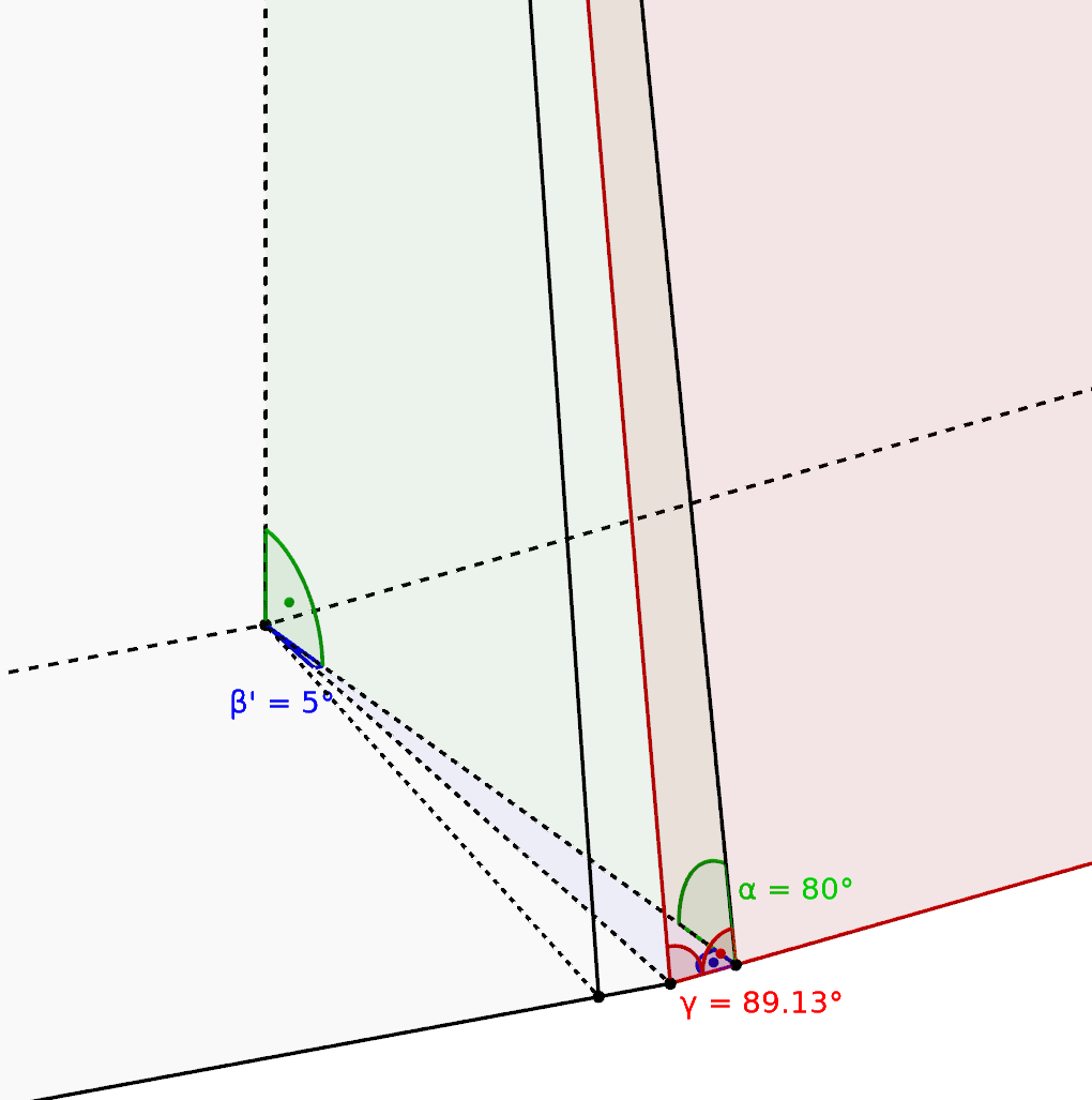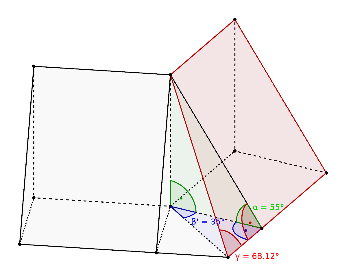 Ich hab's nun doch geschafft, das Ganze perspektivisch darzustellen, nämlich mit GeoGebra, was ein geniales Tool für solche (und viele andere) Aufgabenstellungen ist. In dach2.png ist α=55° und β=70° (β'=β/2=35°), damit das Ganze besser darstellbar ist. GeoGebra berechnet daraus γ=68,12°, was bei der Formel in meinem vorletzten Beitrag übereinstimmt. In dach3.png ist wie in der ursprünglichen Aufgabenstellungen α=80° und β=10°. Auch hier liefern GeoGebra und die obige Formel dasselbe Ergebnis, mämlich γ=89,13°.