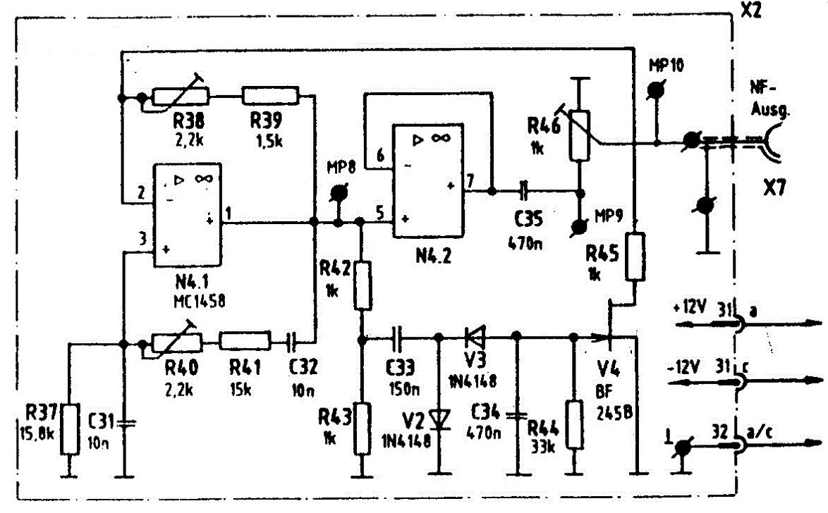 Guten Tag. Im Anhang habe ich eine komplette Schaltung angehängt und ich wollte einfach mal schauen, ob ich die Schaltung richtig verstanden habe. Ich habe mit N4.1 einen Wien-Robinson-Oszillator, welcher durch R37, C31, sowie durch R40, R41 (Frequenzeinstellung) und C32 seine Frequenz (1kHz) erlangt auf der er schwingt. Er schwingt weil die Wienbrücke eine Phasenverschiebung von 0° aufweist und der OP keine Phasendrehung besitzt. Somit kann durch die Mitkopplung das Ausgangssignal wieder auf den Eingang zurückgeführt werden. Da das Aus- und Eingangssignal die gleiche Phasenlage haben, kommt es zu einer sinusförmigen Schwingung. R38 in Kombination mit R39 bestimmen meinen Verstärkungsfaktor. Der Impedanzwandler ist dafür da, dass er mir den Wien-Robinson entlastet. Der Spannungsteiler halbiert mir meine Spannung, die an MP8 anliegt. V2 schaltet mir meine positiven Halbwellen gegen Masse kurz und die negativen Halbwellen durchqueren V3. Wofür ist C33 und C34, sowie C35 da? Bei der Funktion von V4 bin ich mir unsicher, erbitte hier ein wenig Hilfe, warum er da ist und was er macht. Mit R46 kann ich die Amplitude meines 1kHz Sinussignals einstellen, welches dann am Ausgang X7 anliegt. Ich hoffe ich konnte alles recht durchleuchtend erklären ^^ Falls es einfacher geht könnt ihr mir das gerne schreiben. Falls etwas falsch oder fehlerhaft ist, bitte auch korrigieren. Mit freundlichen Grüßen, Maxim