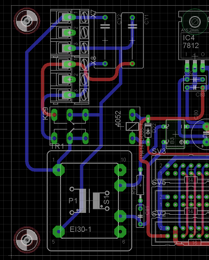 Hallo, Ich habe eine Netzteilplatine für mein Projekt entworfen, ein kleiner Trafo (unten Links auf dem Bild) bleibt ständig am Netz, bei Bedarf wird mit dem Relais K29 ein Ringkerntrafo mit 100VA und ein zweiter Printtrafo mit 10VA zugeschaltet. Hinter den Trafos hängen mehrere Gleichrichter (der RKT hat 6 Abgriffe) und anschließend dicke Siebelkos, der Einschaltstromstoß wird also heftig sein. Mir ist das beim Layouten nicht aufgefallen, die Leiterbahnen sind aber etwas mager dimensioniert auf der Netzspannungsseite, sie sind nur 1mm breit. Die Leiterplatte habe ich schon ätzen lassen, ist fertig bestückt. (FR4 1,55mm 35µm Kupferdicke + Stopplack) Dummer Fehler, mache mir nun etwas Gedanken das die Leiterbahnen irgendwann "verdampfen" wenn das Relais schaltet, meint Ihr die Leiterbahnbreiten sind noch zu vertreten? Danke! Gruß, Jan K.