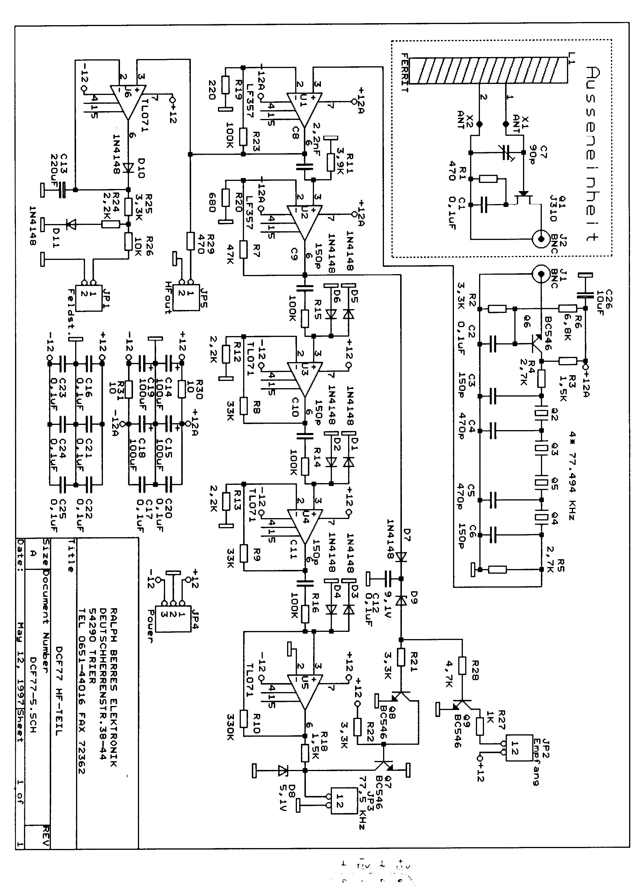 HildeK schrieb: > Im Anhang mein Analogteil und ich muss natürlich zugeben, dass er auf > meinen Empfangsort mit der Verstärkung angepasst wurde - wenngleich rund > 10dB Pegelschwankungen des Empfangssignals durch den Demodulator (T5 und > T6) ausgeglichen wurden. Mit dem Poti am Quarzfilter kann man die > Empfangsbandbreite sehr schön einstellen - so eng, dass die Flanken > schon müde werden. Hier mal das Frontend meines DCF77 Empfängers. Ralph Berres