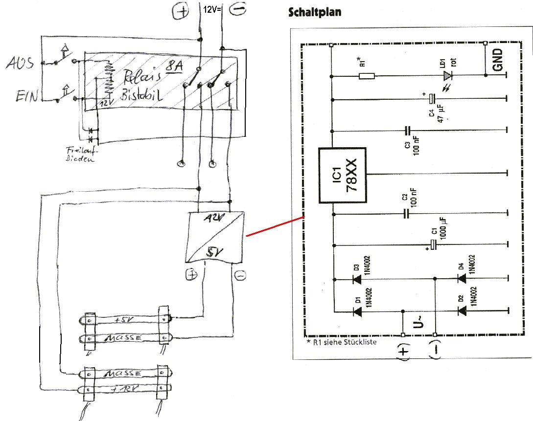 'tschuldigung, mußte erst scannen .. :-) Also das Schaltnetzteil kan 12V, 5A. Die 12V werden nur mit ca. 0.75A belastet. Da müßte doch genug 'Luft' f.d. 5V-Strom sein .. ? Und hier ist der Schaltplan .. (sorry, nur schnelle Skize). Geht das so ?