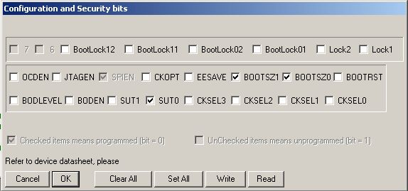 Es gibt für beide Arten der Häckchen einen Sinn: Für Häckchen = 1: bit gesetzt Für Häckchen = 0: Fuse programmiert. Daher steht in einem ordentlichen Programm auch dabei ob ein Häckchen jetzt sich auf eine programmierte Fuse oder auf ein gesetzes Bit bezieht. Am besten ist es aber so wie im AVR Studio: Man wählt z.B. "externern Quarz>1MHz, BOD aus" aus, und das Programm stellt die Fuse Bits automatisch ein.