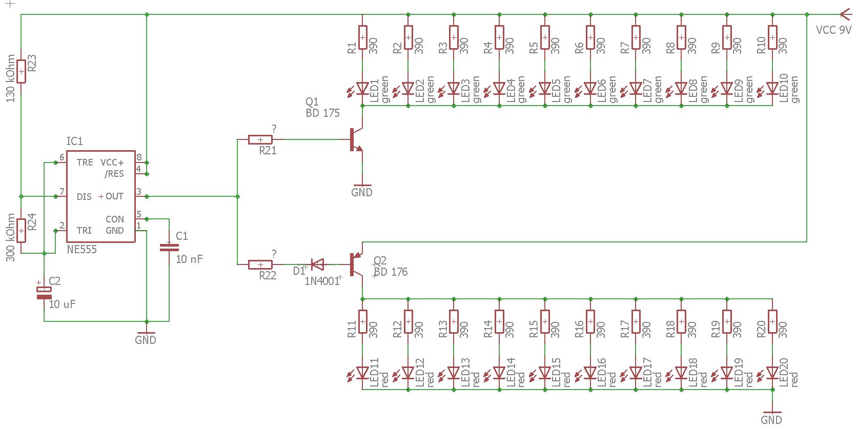 Hallo Zusammen hab nachfolgende Schaltung versucht an zu passen; http://www.gadgetronicx.com/led-lighting-circuit-diagram-ic555/ Einschaltzeit T1: 3000 ms (2.98 s) Ausschaltzeit T2: 2000 ms (2.08 s) Kondensator C2: 10 uF R23: 130 kOhm R24: 300 kOhm LED 1 - LED 10 haben zusammmen 200 mA Led 11 - LED 20 haben zusammen 200 mA BD175 NPN und BD176 PNP haben beide IC=3A R21 und R22 möchte ich berechnen komme aber nicht weiter. Wenn ich NE555 mit 9V am Pin 8 betreibe habe ich am Pin 3, 9V und maximal 200 mA habe ich das richtig verstanden? um den Vorwiederstand (R21/R22)zu berechnen muss ich hfe haben vom Transistor. Im Datenblatt wo beide Transistoren aufgeführt sind (BD175_BD176.gif) steht für beide Transistoren hfe 100 - 250. Wenn ich also Pro Transistor min. 200 mA (Ic) haben muss für die Dioden, mit welchem hfe Wert rechne ich dann, das ich den Wert für R21 respektive R22 bekomme? Reicht es aus für IC 500 mA an zu nehmen ? Kann Die Schaltung so funktionieren oder habt Ihr bedenken ?