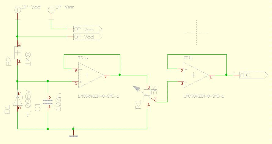 @Profi, danke! Wieder was gelernt. Um nicht die fertige Platine zu verhunzen: Der LMC6482 dürfte funktionieren? Wichtig ist geringer Eigenverbrauch (<2mA). Schnell muß er nicht sein (mech. Poti;) und ne kleine Handvoll Offset ist tolerabel (9bit Auflösung angestrebt; 4,096V/512=8mV) Gruß Frank
