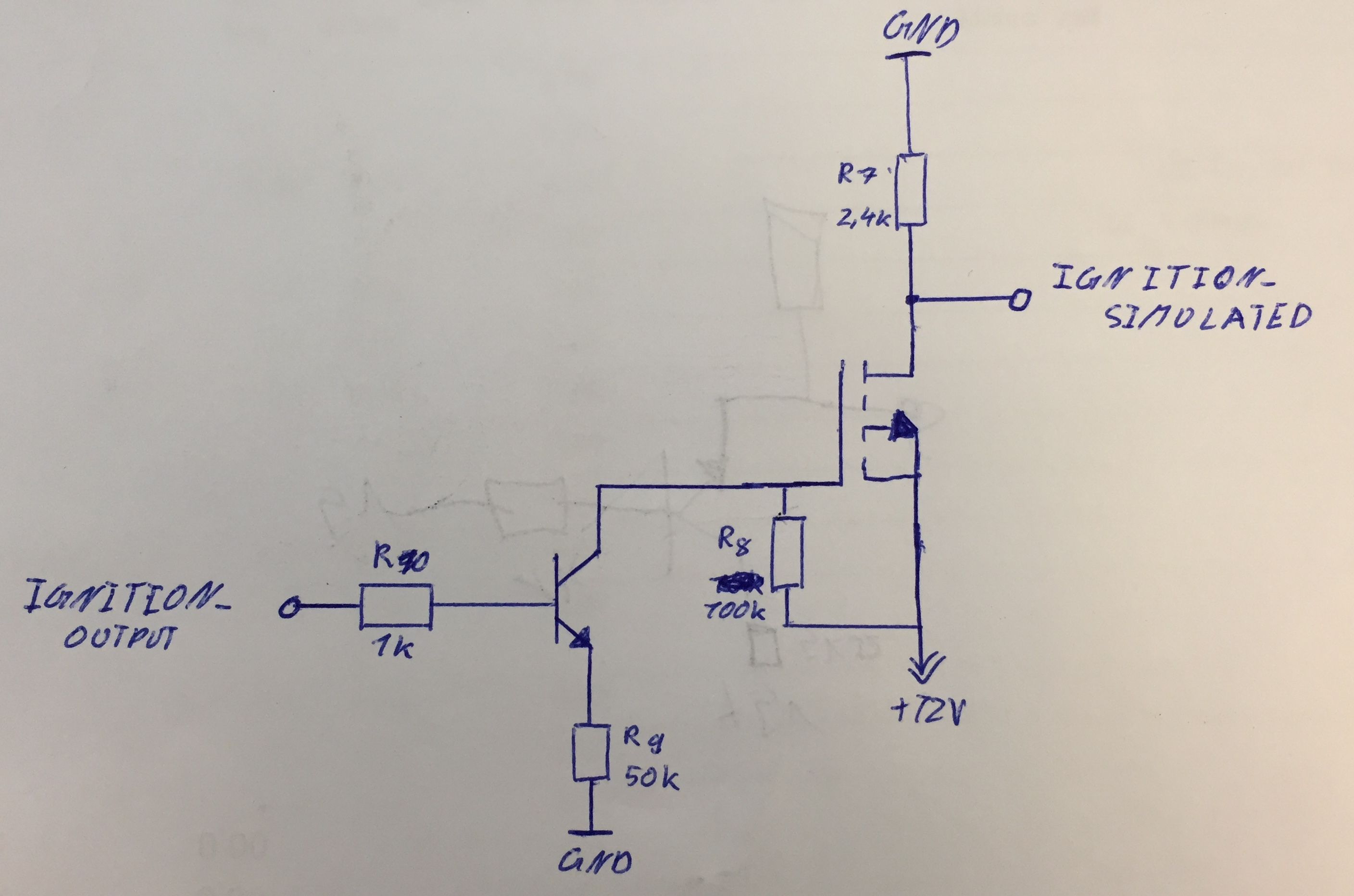Der LP2950 ist ein Spannungsregler und kein Transistor... Der Teil mit dem MOSFet der die 12V an die Zündungsleitung schaltet wird so nicht gehen, bei 12-5=8V UGS wird der durchgehen an sein. Du brauchst einen zweiten (NPN-Transi ?) Schalter der das Gate Open-Collector mäßig an Gnd zieht.