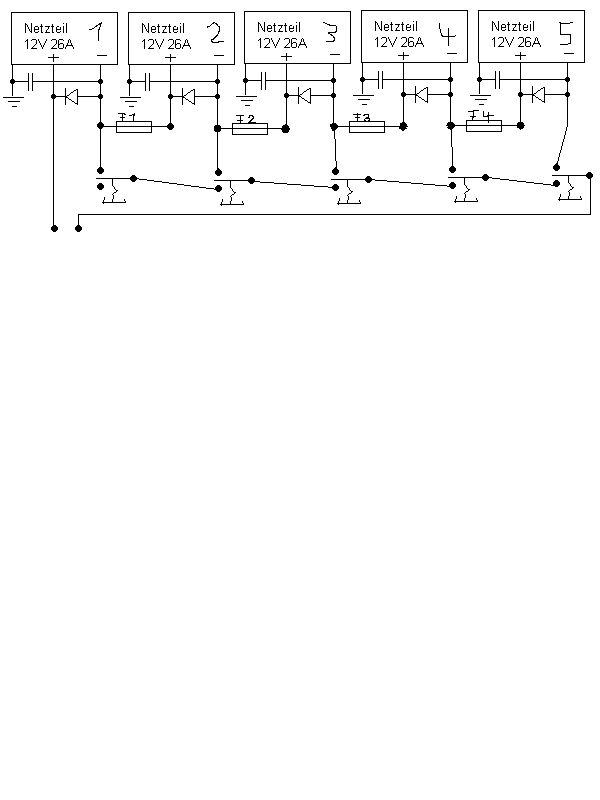 Ich werde mir ein bisschen leistungsfähigeres Netzteil bauen. Dazu habe ich mir 5x 12V/26A Server-Netzeile besorgt ( auch schon die Erde vom Sekundärkreis getrennt). Ein großes Gehäuse mit Netzfilter steht auch schon bereit. Vorrangig will ich 60V mit den 26A aus dem Netzteil bekommen doch ich möchte es so vielfältig einsetzbar wie möglich machen. Ich habe noch ne menge Step-up und Step-down Wandler die ich in dem Netzteil einbringen will. Der bisherige Plan siehe Bild: Mit den Wechselschaltern kann ich die Spannung in 12V schritten einstellen und mit den Sicherungen kann Netzteile von einander trennen um mehrere galvanisch getrennte Versorgungen zu haben die ich mit den Step-up oder Step-down regeln kann. Jetzt stehe ich aber ein bisschen auf dem Schlauch wie am besten die Wandler in die Schaltung einbringe. Ich möchte auch nicht 100 Stecker mit einem Kabel-gewirr an der Front von meinem Netzteil haben. Auch massig 30A Relais die 60V schalten habe ich gerade nicht vorrätig um das ganze mit einem Arduino zu regeln ( die Option ist zwar nicht verworfen aber erstmal muss es ordentlich funktionieren. Hat schon mal jemand ein ähnliches Projekt gesehen von dem ich ein bisschen abschauen kann ? Edit: Ganz vergessen Meine Wandler die ich noch zur Verfügung habe: 10-32V auf 60-97V DC 100W 8-32V auf 45-390V AC 75kHz 150W 12V auf 110-220V AC 20kHz 150W 8-60V auf 12-83V DC 1200W ( der Grund für das Netzteil ) 3-6V auf 400kV 15W 4-38V auf 1,25-36V 75W ( 2 Stück die auch von aneinander getrennt eingesetzt werden sollen )
