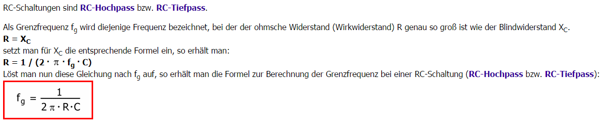 Viel Danke W.A. Der Signal kommt von einem Sensor (drehzahl Messung),was meinen Sie mit Ausgangsimpedanz der Quelle? C und R sind unbekannt ,ich brauche R oder C ,damit ich diese Formel benutzen kann