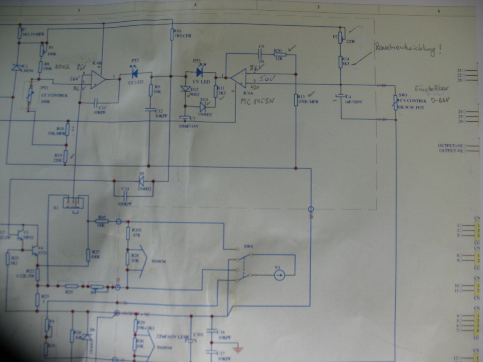 Hallo, bin leider mit meinem Latein am Ende.Habe von Voltcraft das VLP-1602 nur leider ist die Ausgangsspannung, die es am Display anzeigt, nicht mehr regelbar sondern zeigt stets 86V an. Ich konnte bei Netzverbindung an dem R14 Rauchentwicklung feststellen. Diesen habe ich erneuert aber der Fehler blieb.Die Bauteile mit einem Häkchen habe ich überprüft. Kann mir bitte jemand sagen wie ich den Fehler eingrenzen bzw. wie ich sinnvoll vorgehen könnte. Vorab besten Dank Rüdiger
