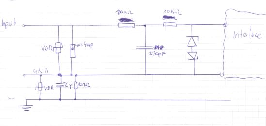 Bin grad am Lernen für eine EMV-Prüfung. Soll folgende Frage (siehe Bild) lösen. also hab mir das eben so vorgestellt: Der VDR bzw. der Gasableiter verträgt ja ein wenig mehr Ableitenergie als die Suppressordioden also schalt ich mal zur Sicherheit diese vor die mir schon mal einen Teil der hohen Spannung eleminieren wenn sie zünden bzw. ansprechen. Weiters hab ich einen Filter eingebaut der mal so ab der 3.Oberwelle dämpfen soll bzw. aus der Zeitkonstante T=RxC das T-Filter sowieso eine gewisse Zeit benötigt um sich vollkommen aufzuladen und wenn der Impuls nur kurz anliegt also kleiner T ist kann sich der Kondi nicht vollkommen aufladet ich verlier hier wiederum Spg. Zu beachten sind aber die Widerstände die 1. den strom durch Dioden begrenzen müssen bzw. deren eigene Verlustleistung (P=U²/R bzw. P=I²xR) oder??? Die Antiseriell geschalteten Suppressordioden sollen das Signal auf 5,7V bzw. -5,7V begrenzen. (ist zwar a bissl mehr als in der Angabe aber najaa..) So nun soll auch noch die Spannung zwischen Masse und Erde +/- 500V sein mhhh einfach wieder nen VDR bzw. nen Gasableiter schalten oder wie ähhhm ?? Wie kann ich nun die Stossströme abschätzen bzw. Ansprechspannung??? Wäre total supa wenn mir da wer weiterhelfen bzw. mich aufn richtigen weg bringen könnte. schönen abend! manfred