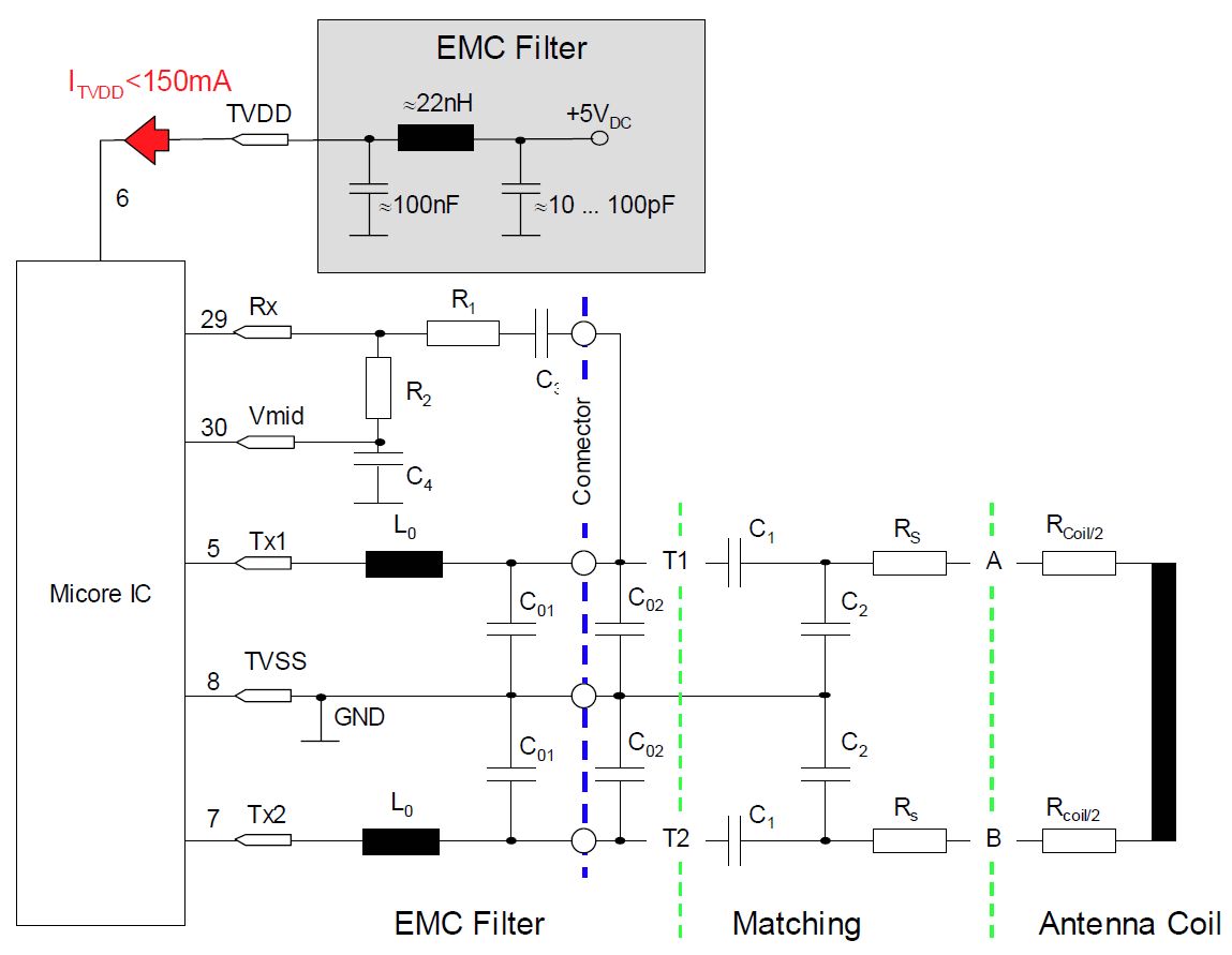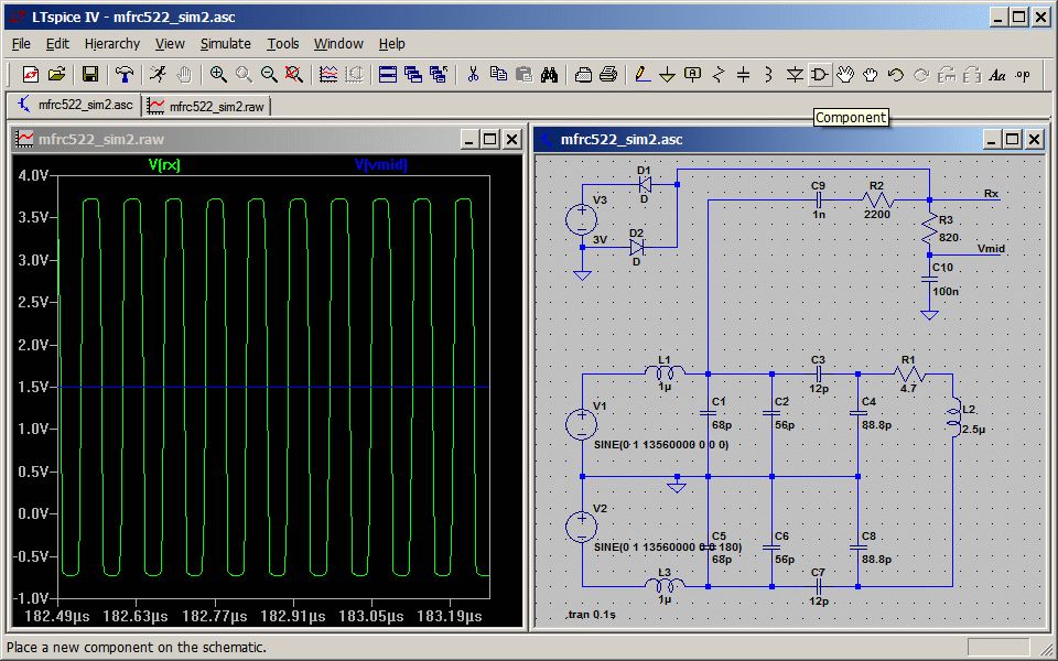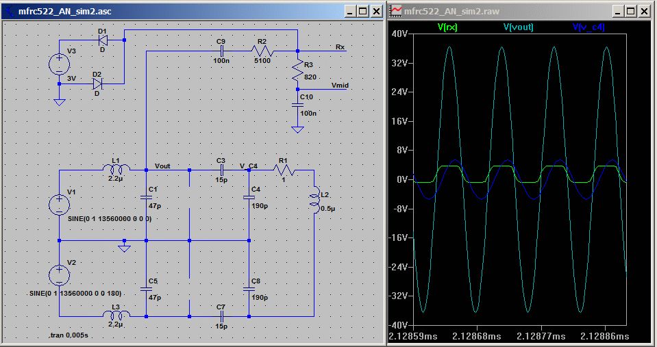 Hallo Marcus, OK, dann wird's ja werden. Nur noch eine Anmerkung zu Deiner Simulation: Die DC Vorspannung darfst Du so nicht direkt aus V3 an Rx anlegen, die Dioden klippen dann ja Deine RX-Amplitude, sieht man auch schön in Deinem Screenshot. Tatsächlich liefert der MFRC selbst die Vorspannung an VMid, in der Simulation mußt Du V3 also auch dort anlegen. Gruß... Bert
