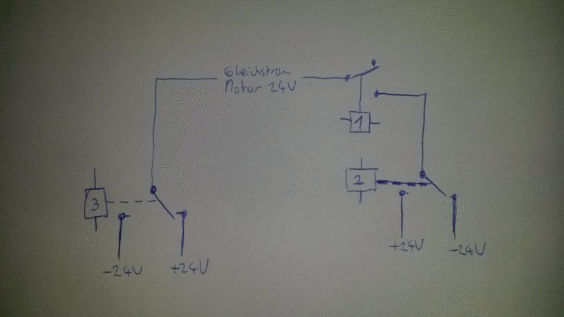 Ich habe einen Gleichstrommotor zum Lenken einer fahrbaren Hebebühne. Die Schaltung mittels Transistoren ist hinüber und ich kann den Fehler nicht finden. Nun brauche ich aber schon morgen die Maschine zur Ernte und habe mir eine Schaltung mittels Relais ausgedacht (siehe Anlage). Dabei wird entweder nur das mit 1 gekennzeichnete 5V-Relais geschaltet (Motor linkslauf) oder alle drei gleichzeitig (Motor rechtslauf). Ich bin beim Ausprobieren stutzig geworden, da komischerweise bei ausgeschaltetem Relais 1 noch Spannung an den Anschlüssen des Motors anliegt und zwar wenn ich den Motor ausstecke (ca. 8 Volt). Wo die herkommt, kann ich mir beim besten Willen nicht erklären, aber sie reicht nicht aus, auch nur eine kleine KFZ-Leuchtbirne zu betreiben. Bei angeschlossenem Motor kann ich keine Spannung mehr messen. Die Schaltung funktioniert soweit, aber ich möchte nicht auch noch den Motor oder sonstwas schrotten. Etwas recherchieren hat mir den Begriff Schutzdiode gebracht. Brauche ich so etwas für meine Schaltung? Kann mir bitte jemand zeitnahe sagen, ob ich da noch was machen muss, sonst weiß ich nicht, ob ich mich morgen trauen soll, die Familie arbeiten zu lassen? Danke Joachim