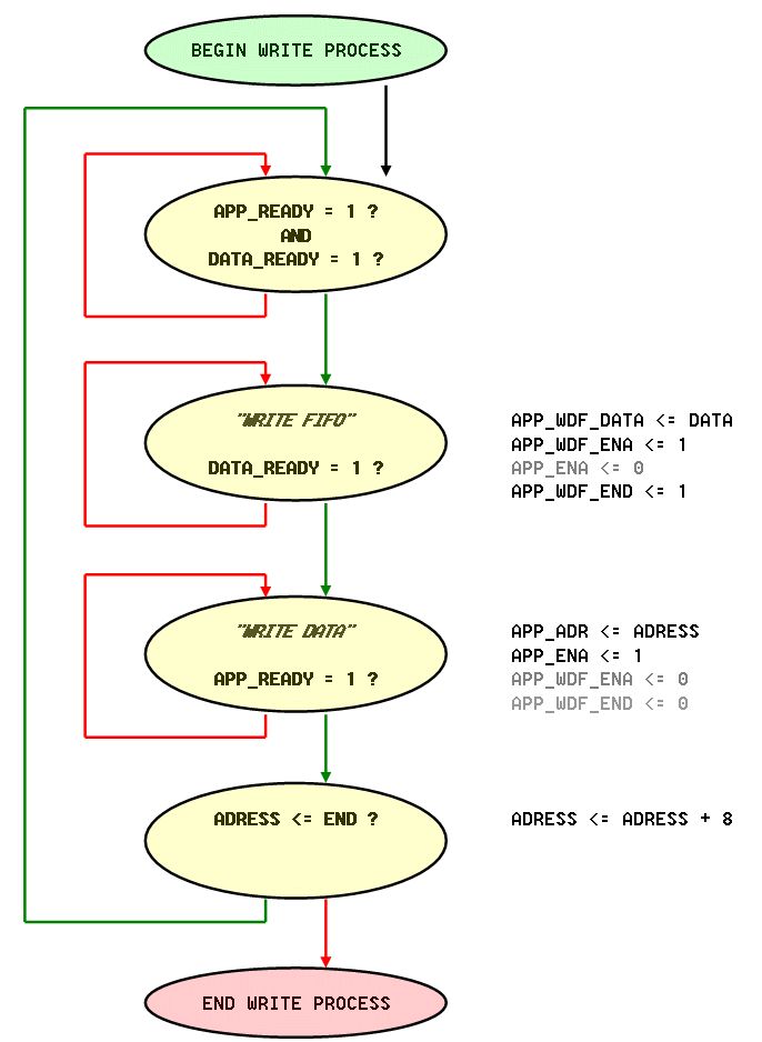 Ich habe einen Arbitter, der jetzt für jeden Port einmal liest und schreibt. Damit komme ich mit Faktor 1/4 auf das DDR, was eigentlich reichen sollte. Der Arbitter holt sich selber die Daten aus zwei Zwischen-RAMs auf die die Prozesse schreiben. Von der Seite gibt es also erst einmal kein Problem. >Der Nativ-Mode ist aber auch nicht weiter kompliziert. Ich beziehe mich auf die MIG-Doku, die ein timing dafür hat, was mir auch plausibel ist und so schon implementiert wurde. Es gibt jetzt eine Unklarheit: >Je nach Anzahl und Breite der Speicherbausteine ist das eine >Word, DWord, QWord oder noch höhere Adresse Ich habe einen Baustein mit 8 Bit und will eigentlich immer 8 Bytes auf einmal schreiben. Damit passt das genau zu DDR3. Der Port ist 64 Bit breit, kommt schon so vom CoreGen und ich hänge die 8 bytes einfach aneinander. Das Höchste ist dabei das letzte, wegen der Bytereihenfolge. Die Adressen zähle ich immer um 8 weiter, überspringe also wie gehabt die unteren 3 Bits. Das müsste so funzen und scheint auch zu stimmen, wenn ich die zurückgelesenen Daten heranziehe. Aber leider stimmen die nicht immer. Ich habe auch noch nicht rausfinden können, ob es am Lesen oder Schreiben liegt. Die Reproduzierbarkeit an bestimmten Stellen scheint eher dafür zu sprechen, dass das Schreiben schief gegangen ist. Ich denke, es hat was mit dem APP_READY zu tun. Der vorhandene Code läuft so, daß gewartet wird, bis data_ready und app_ready der Fall sind und dann erfolgt ein Schreibbefehl, bzw Lesebefehl mit zunächst einem app_ena und data_ena. Laut Doku muss ich so lange warten, bis beide noch im nächsten Takt der Fall ist. Ich springe also erst nach Prüfung beider Signale wieder aus dem state heraus. Bei einzelnen Daten scheint das zu klappen, aber wenn ich mehr, als ein Datum senden will, bekommt er manche nicht mit. Nun habe ich in der Doku gesehen, daß es ein Problem mit dem data_end gibt. Angeblich soll man das beim letzen Datenwort mit setzen. Da ich immer 64 Bit schreibe setze ich immer data_end auf 1, weil das letzte Byte ja in der Gruppe enthalten ist. Ich beziehe mich da auf ein Diagramm in der Doku. An anderer Stelle wird davon gesprochen, dass das data ena egal sei.(???) Da geht gfs was schief. Dann gibt es noch einen Verdacht: Ich überfahre gfs den Fifo, weil Daten-ENA und APP_ENA nicht passen oder stimmig ausgewertet werden. Dazu gibt es in der Doku einen Hinweis, dass das APP_ENA maximal 2 Takte nach dem DATA_ENA kommen darf. Was ist, wenn ich das nicht einhalten kann? Was passiert mit dem Datum im FiFo? Das wird ja sicher nicht vernichtet. Ich habe es ausprobiert und finde, dass man ruhig mehrere Takte warten kann und es wird dennoch gelesen. Es kann aber auch eine Fehlinterpretation sein, weil ich ja dauernd schreibe und lese und gfs die falschen ENAs zusammensortiert werden. Ich habe den Verdacht, dass manche APP_ENAs ins Leere gehen und den internen MIG-FiFo aufblähen und da was daneben geht. Dazu passend wäre noch die umgekehrte Frage zu stellen: Wie nahe darf APP_ENA dem DATA_ENA sein? Eigentlich möchte ich mehrere Datenworte mit einem APP_ENA erschlagen, momentan reicht es mir aber, wenn es wenigstens Stück für Stück ginge. Daher habe ich es im Moment so, dass ich erst ein Datum in den FiFo schicke, dann warte ob es mit dem ready geklappt hat und dann erst dazu übergehe, einmal APP_ENA mit Write anzuwenden, wobei Ich auch da gfs warte, falls es nicht geklappt hat. Trotzdem kommen Fehler...