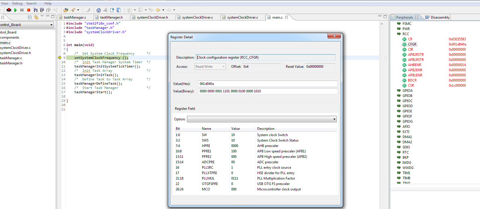 Vielleicht hilft dieser Ausschnitt etwas. Unmittelbar nach dem Start des Debuggers ist der System Clock auf PLL eingestellt. Ich habe nur keine Ahnung warum.